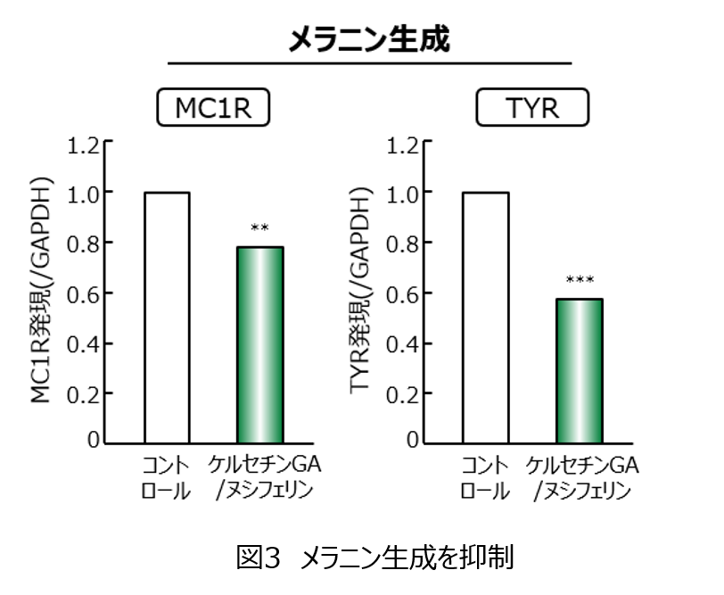 炎症シグナルを受けてメラニン生成が活発になるとシミの発生につながります。同成分は、メラニン生成因子(TYR・MC1R)の発現を有意に抑制します。(図3)。