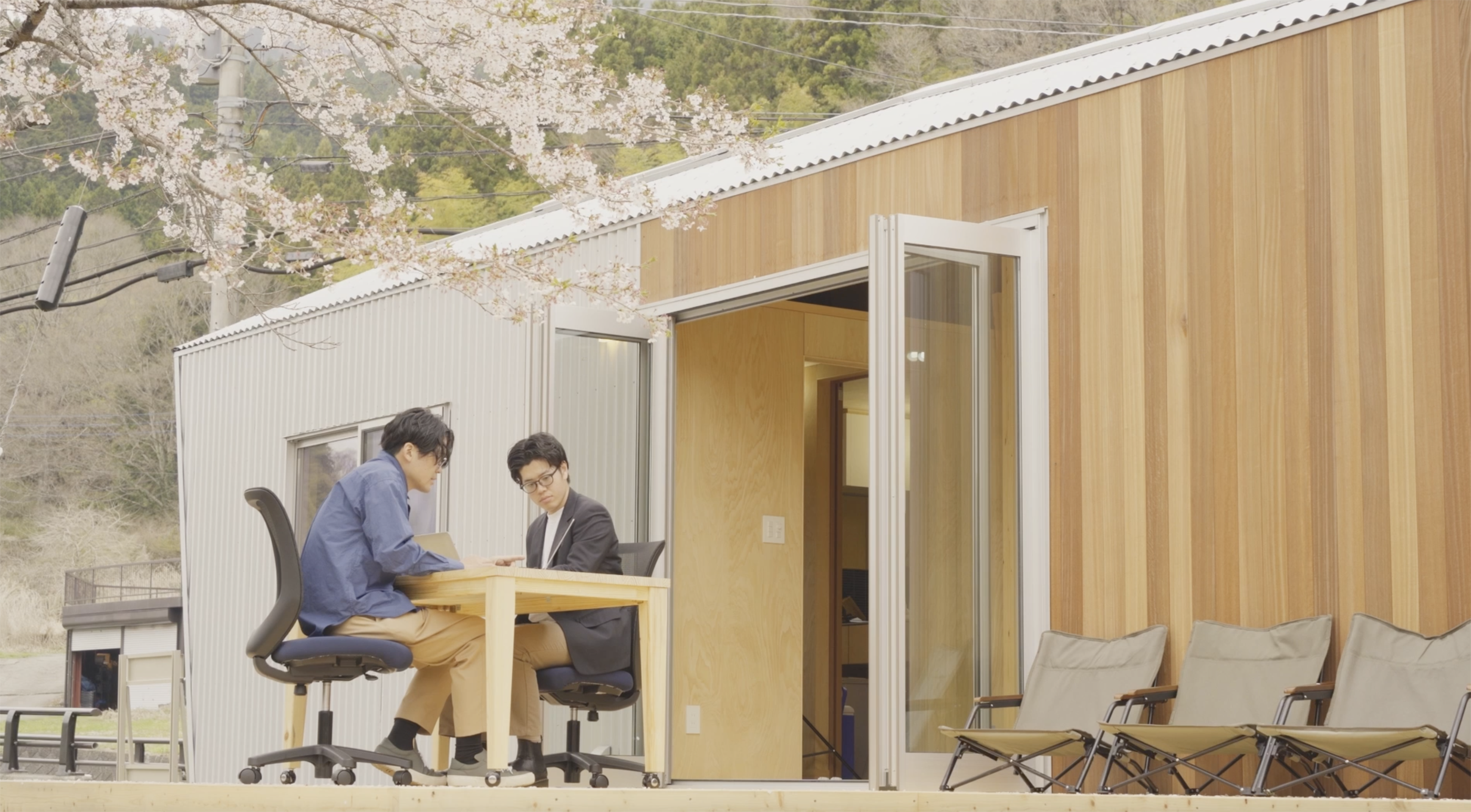 空間の境界を曖昧にすることで、仕事と遊びを両立したライフスタイルを、トレーラーハウスを用いて提案します。こだわりの「えん側(ウッドデッキ)」ではデスクを持ち出し、四季を感じながらワーケーションを楽しむことが出来ます。