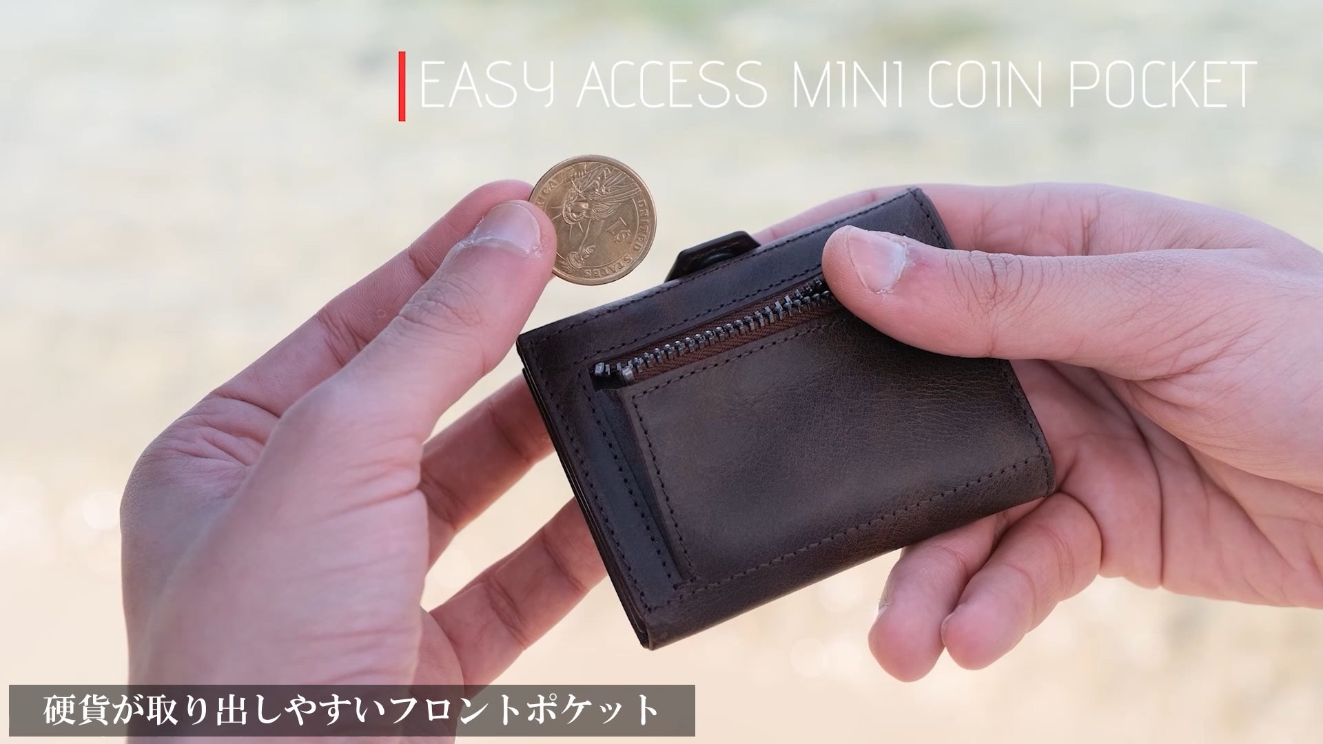 小銭入れが浅いため、大量の硬貨は収納できませんがその分、一目で必要な硬貨を見つけて取り出すことができます。小銭入れは外側に付いており、財布を展開せずに素早く取り出すことができます。