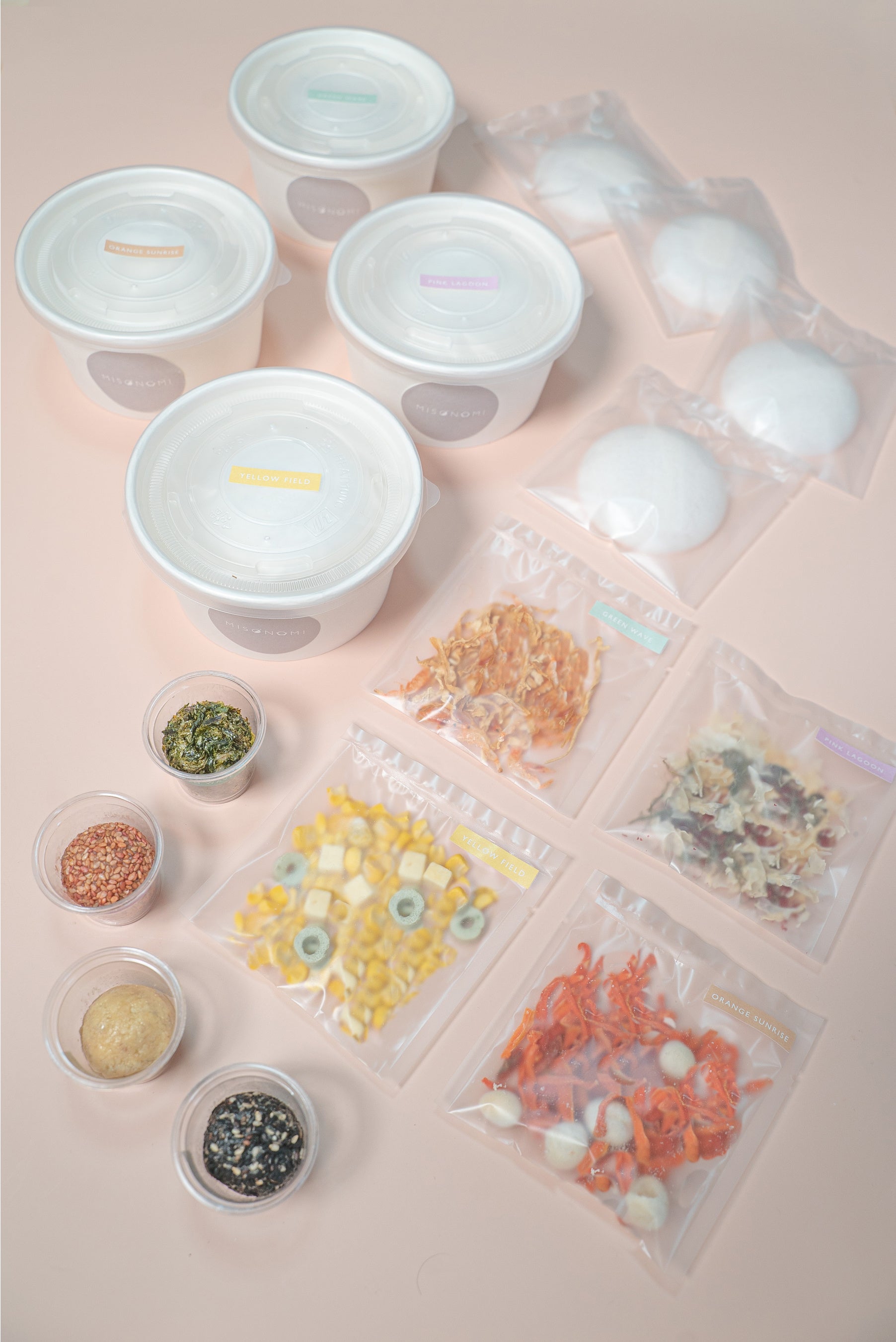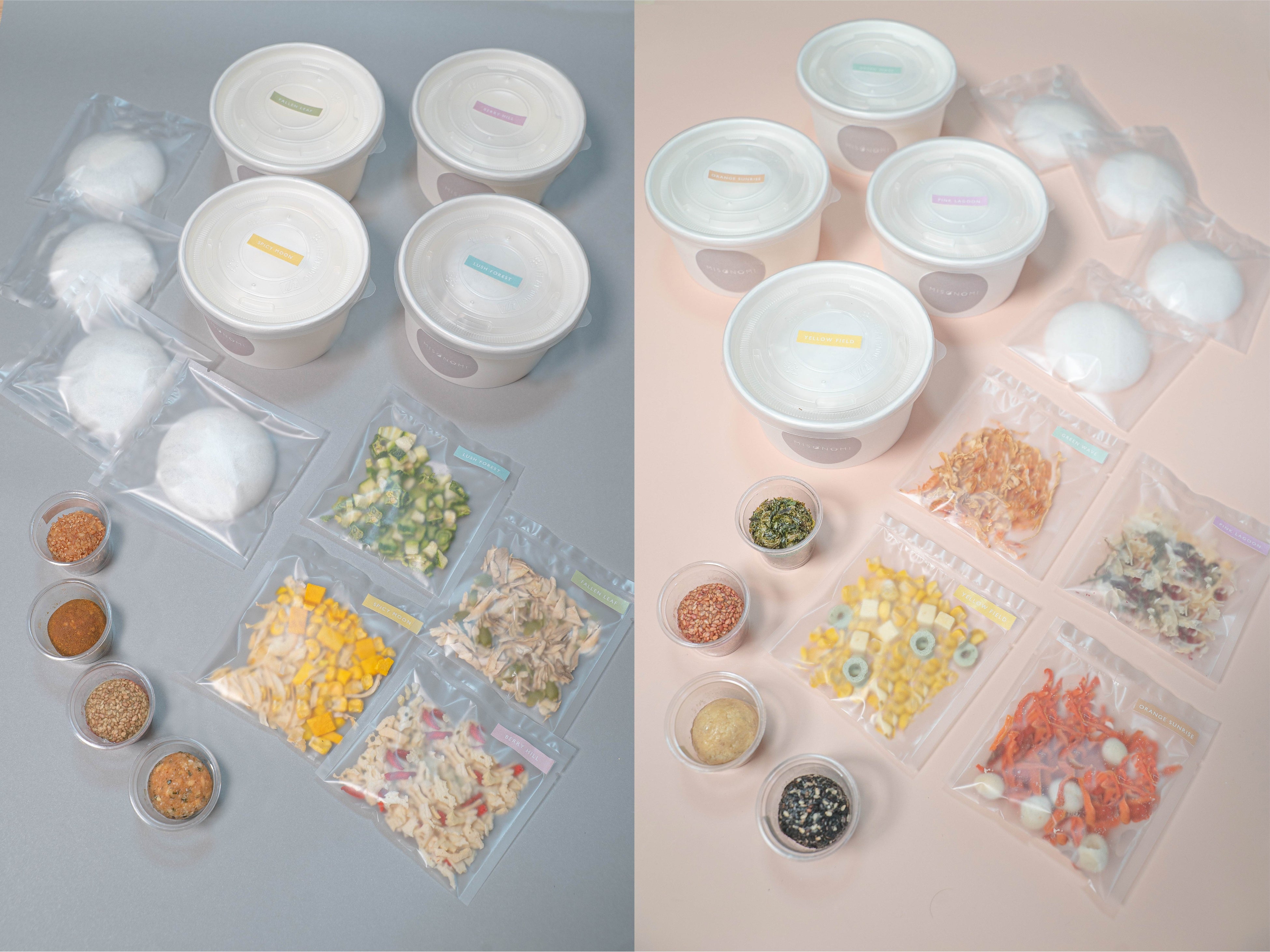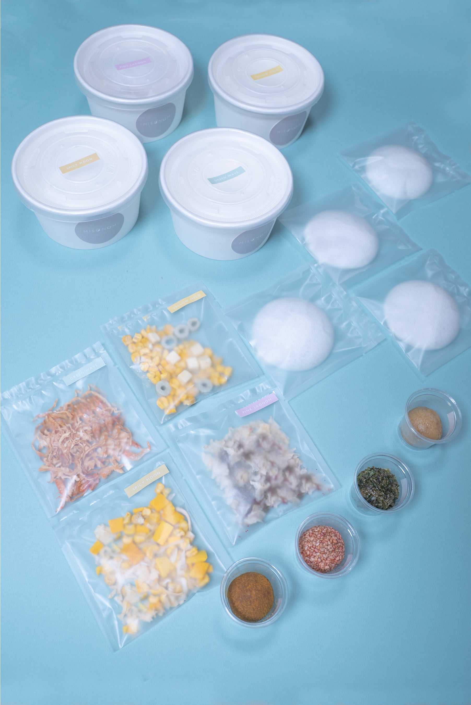 MISONOMIはキャンバスに見立てたもなかに、彩り豊かなフリーズドライの具材と旨味たっぷりの生みそを盛り付けた、ちょっと新しいみそスープの実。ご自身の手でお湯を注ぎ、実を崩していくと、温かな一杯が出来上がります。 素材にこだわった甘みのある麦みそとあごだし、ヴィーガンでも楽しめる玄米みそと野菜ブイヨンなど、ヘルシーで旨みたっぷりの出汁とフリーズドライの具材を組み合わせました。カレースープやポタージュスープ、スパイシースープなど8種の個性豊かなスープそれぞれには、春夏秋冬の情景や広大な景色と色彩をモチーフにして、アートのような作品名が付けられています。