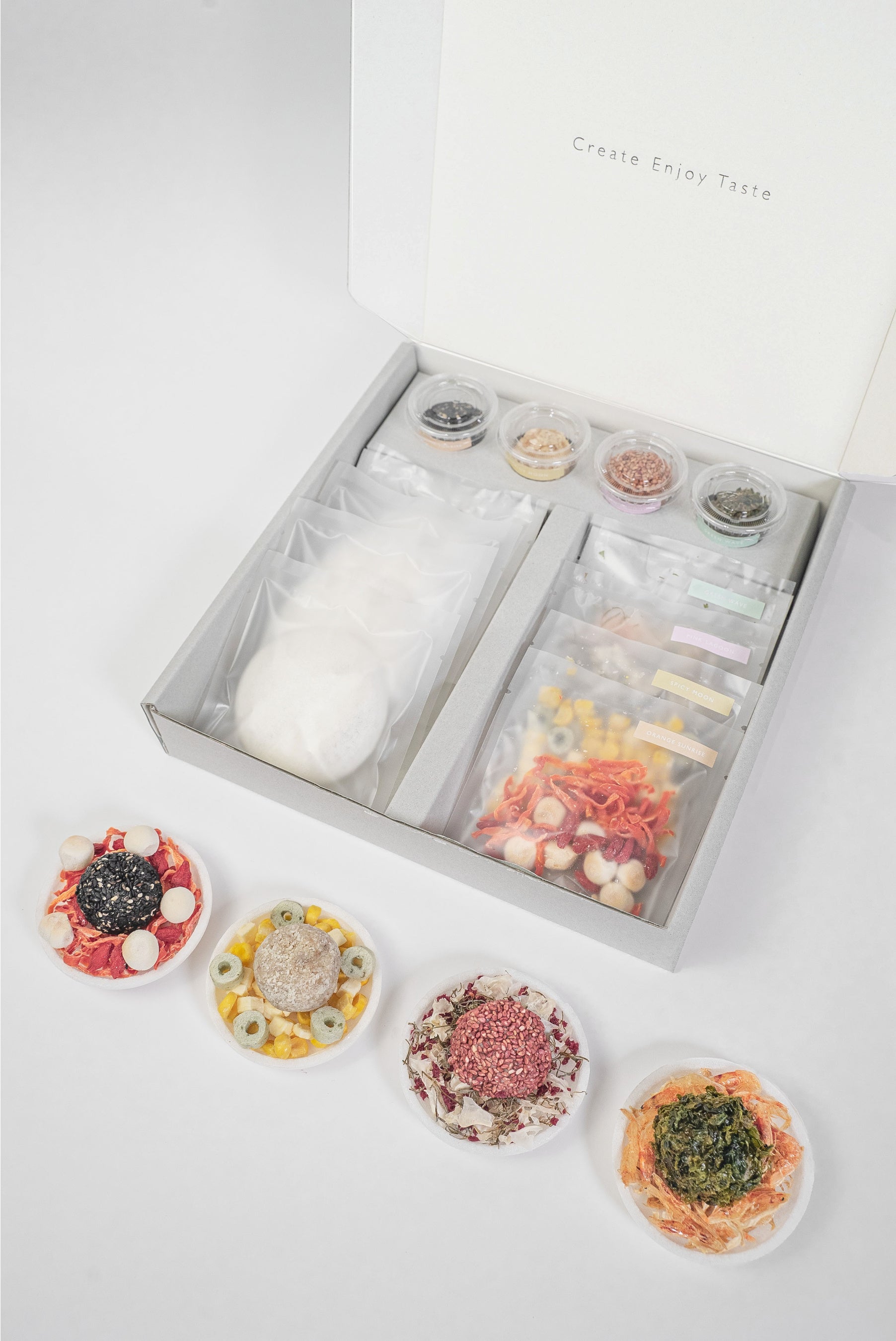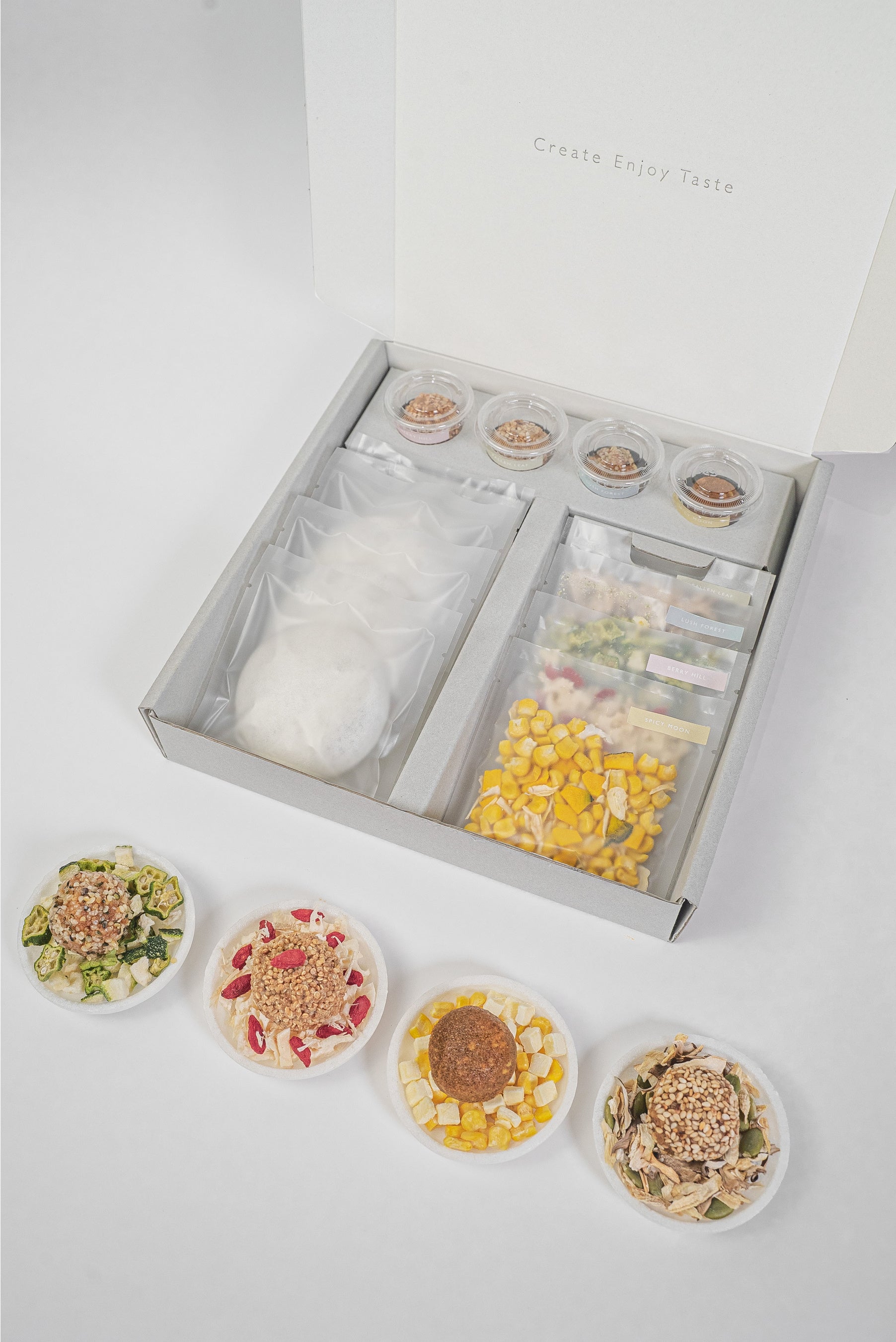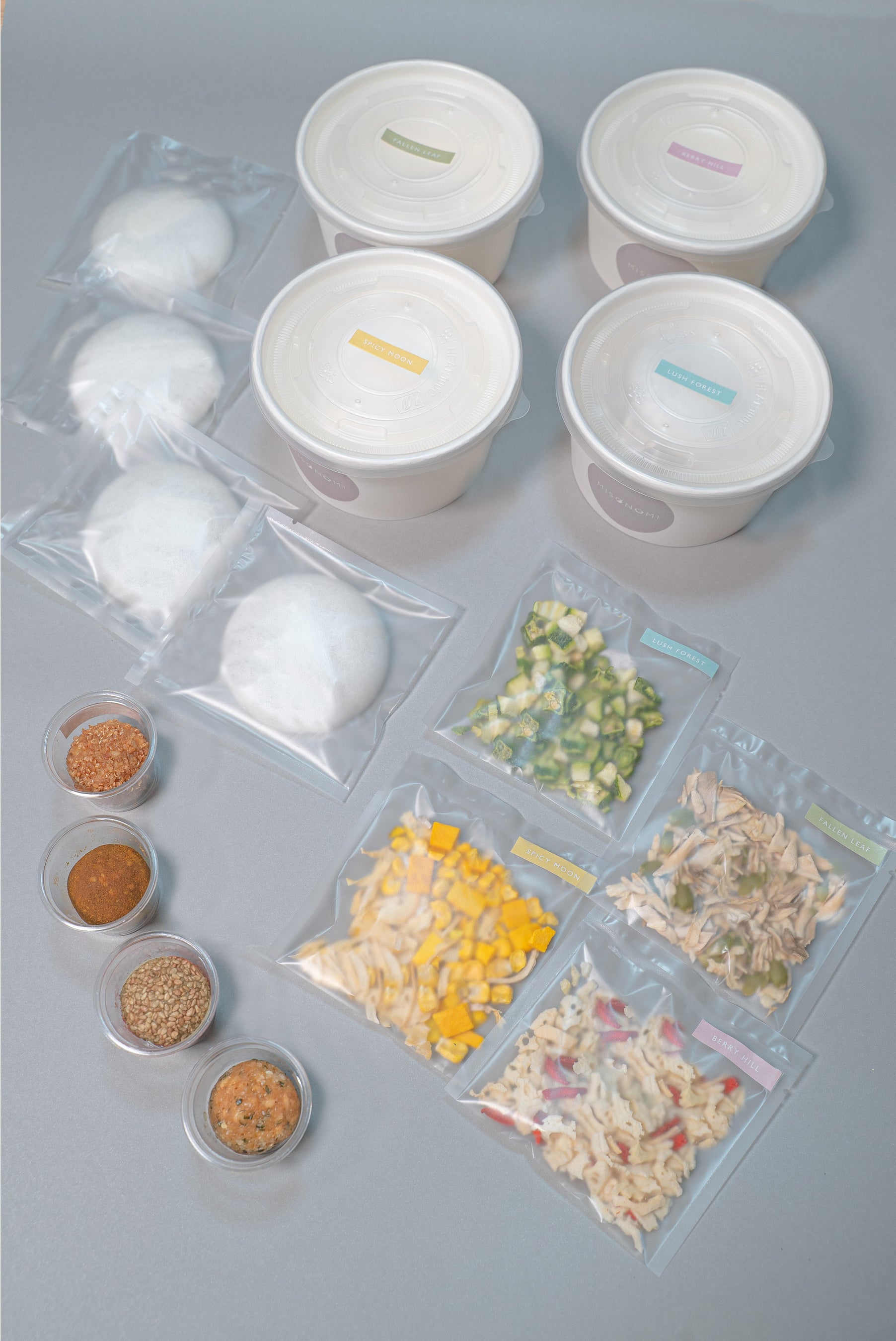 MISONOMIはキャンバスに見立てたもなかに、彩り豊かなフリーズドライの具材と旨味たっぷりの生みそを盛り付けた、ちょっと新しいみそスープの実。ご自身の手でお湯を注ぎ、実を崩していくと、温かな一杯が出来上がります。 素材にこだわった甘みのある麦みそとあごだし、ヴィーガンでも楽しめる玄米みそと野菜ブイヨンなど、ヘルシーで旨みたっぷりの出汁とフリーズドライの具材を組み合わせました。カレースープやポタージュスープ、スパイシースープなど8種の個性豊かなスープそれぞれには、春夏秋冬の情景や広大な景色と色彩をモチーフにして、アートのような作品名が付けられています。