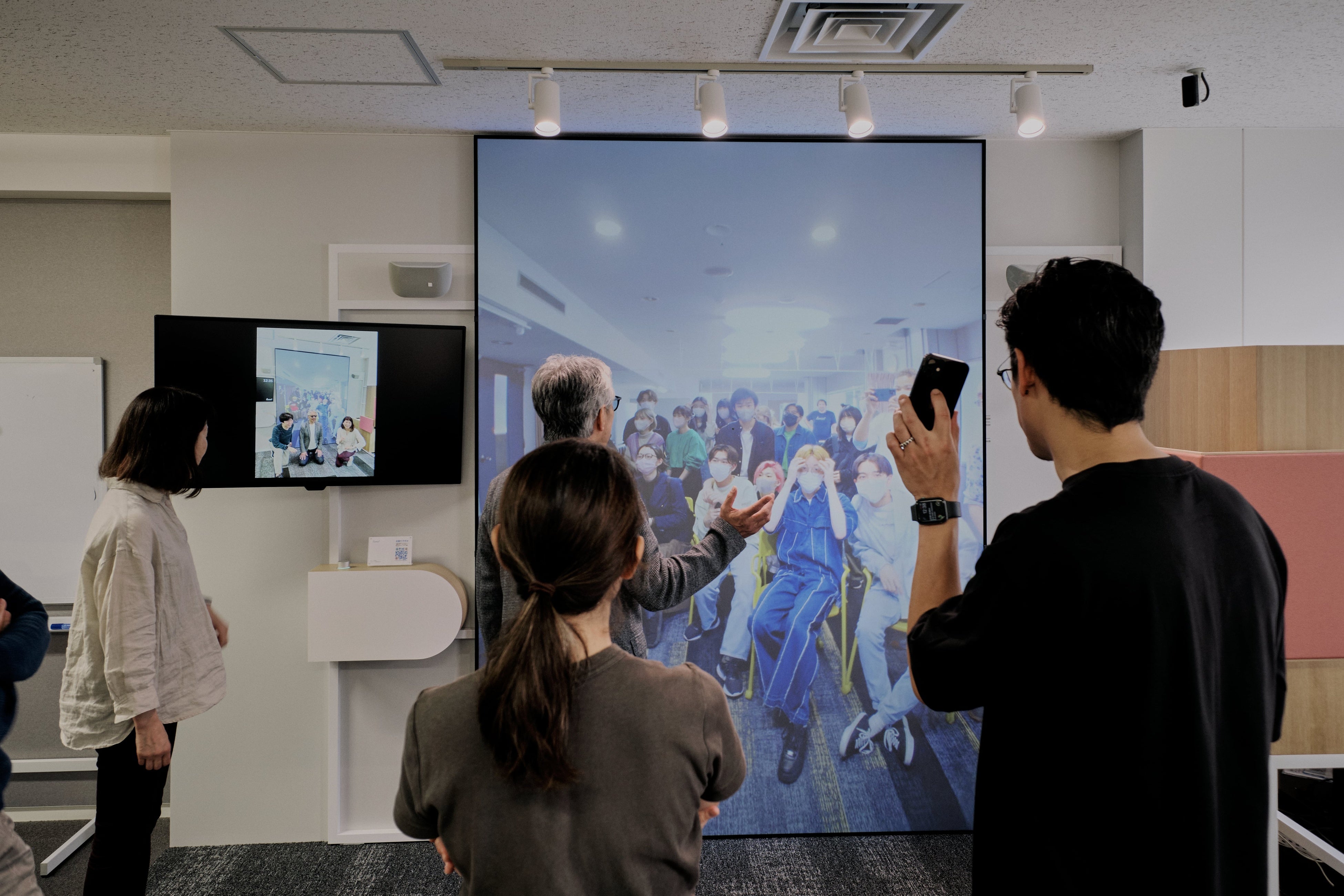 tonariは、等身大のスクリーンを介して2つの空間を繋ぐ、全く新しいコンセプトによるコミュニケーションツールです。オンライン会議特有の映像・音声の遅延によるストレスが無く、壁一面の高画質スクリーンと遠近の違いを音で理解できる設計が施され、同じ空間にいるように一緒に過ごすことができます。