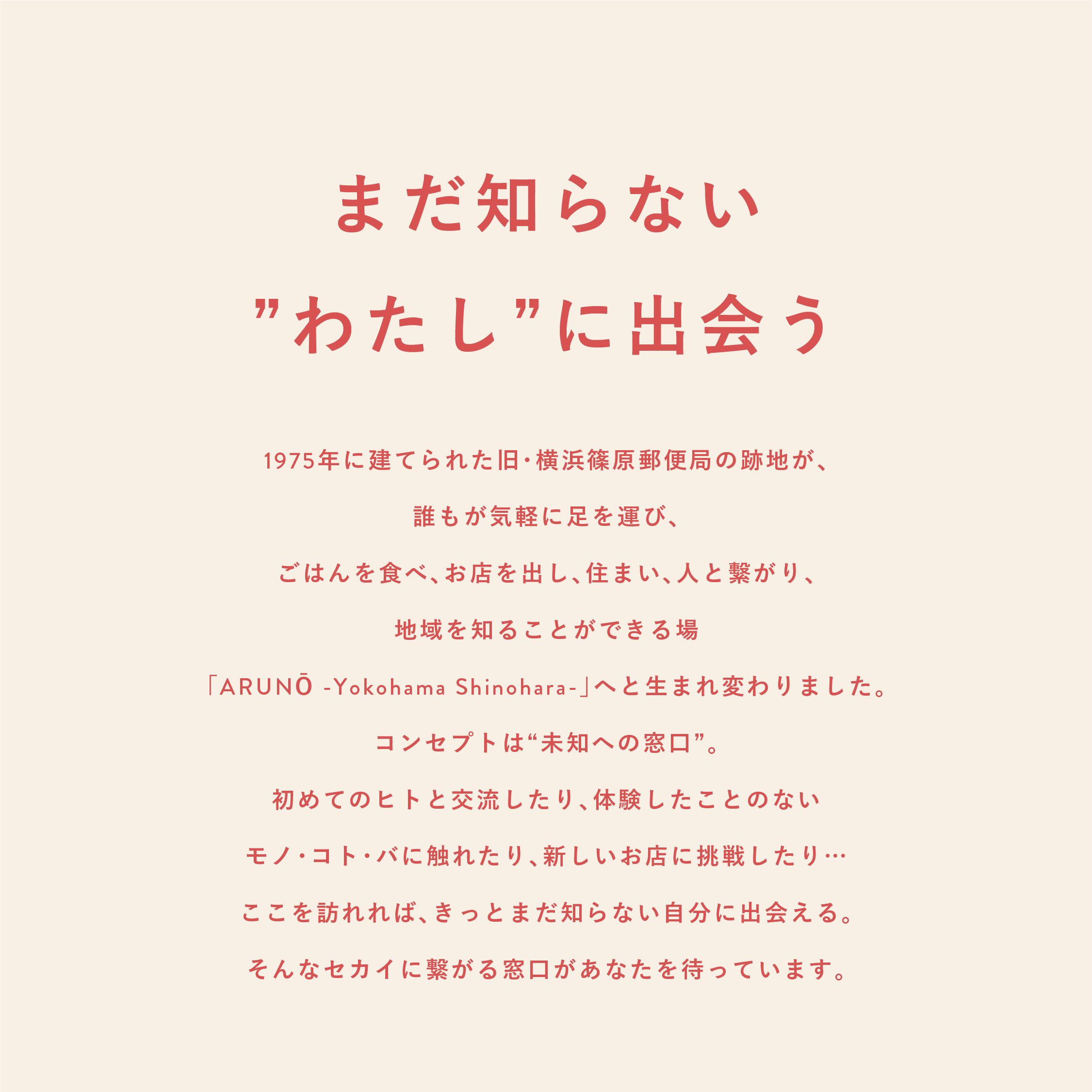 - 「ARUNŌ -Yokohama Shinohara-」6つのコンテンツ