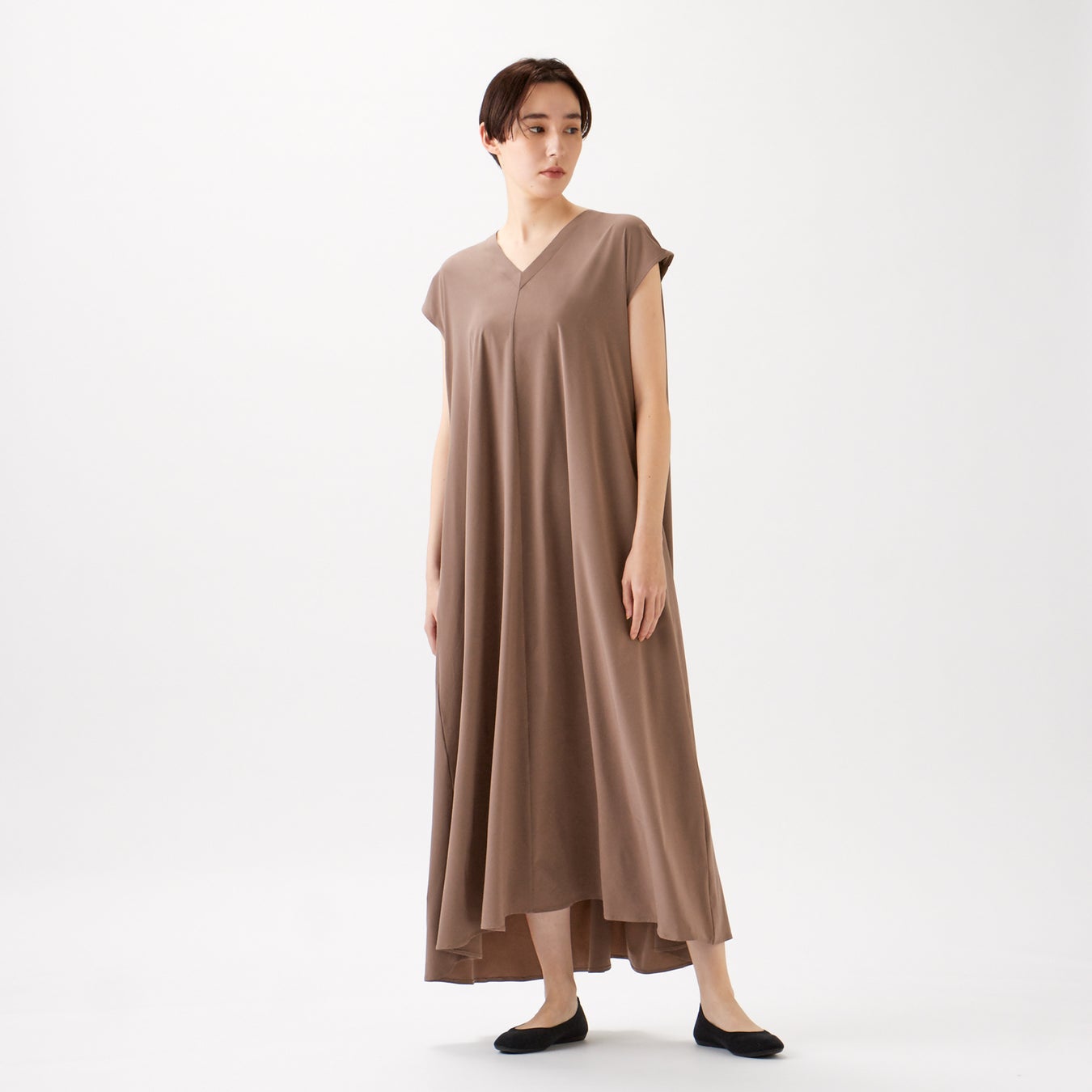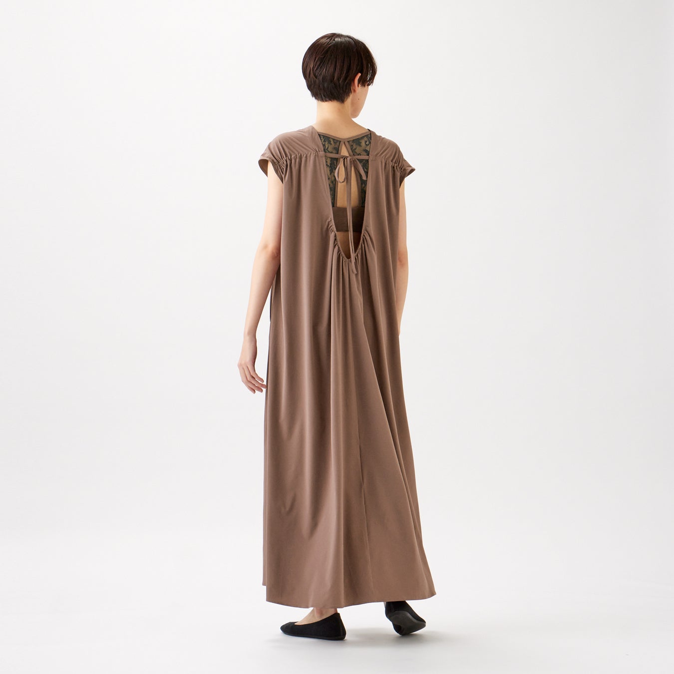 薄くソフトな風合いの布帛素材を使用したマキシ丈のワンピース。背中のあきが広いので、さまざまなインナーアイテムとのレイヤードが楽しめます。