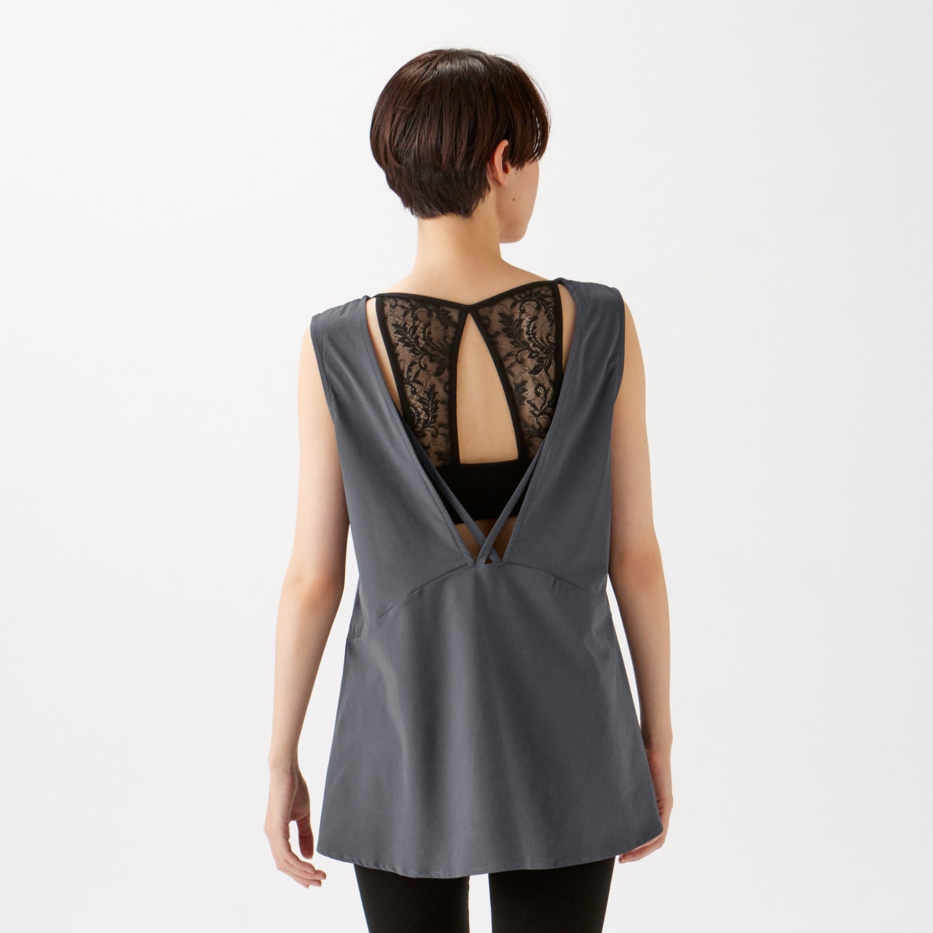 着ていることを忘れてしまうほど軽く、汗をかいてもべたつきにくい、暑い季節におすすめのイージーケア素材です。背中のあきが広いので、さまざまなインナーアイテムとのレイヤードが楽しめます。コーディネートアイテムによって、デイリーからアクティブシーンまで幅広くお使いいただけます。
