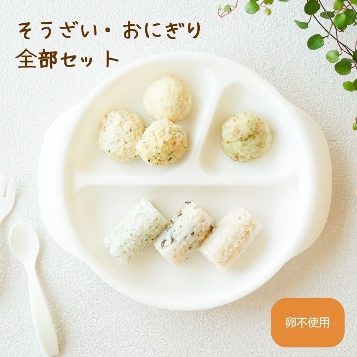 北海道産じゃがいものおやき、ぶた肉と野菜入り豆腐ハンバーグ、とり肉と野菜入り豆腐ハンバーグ、お魚入り豆腐ハンバーグ、小松菜とかつおぶしの軟飯おにぎり、きな粉とすりごまの軟飯おにぎり、あおさとしらすの軟飯おにぎり