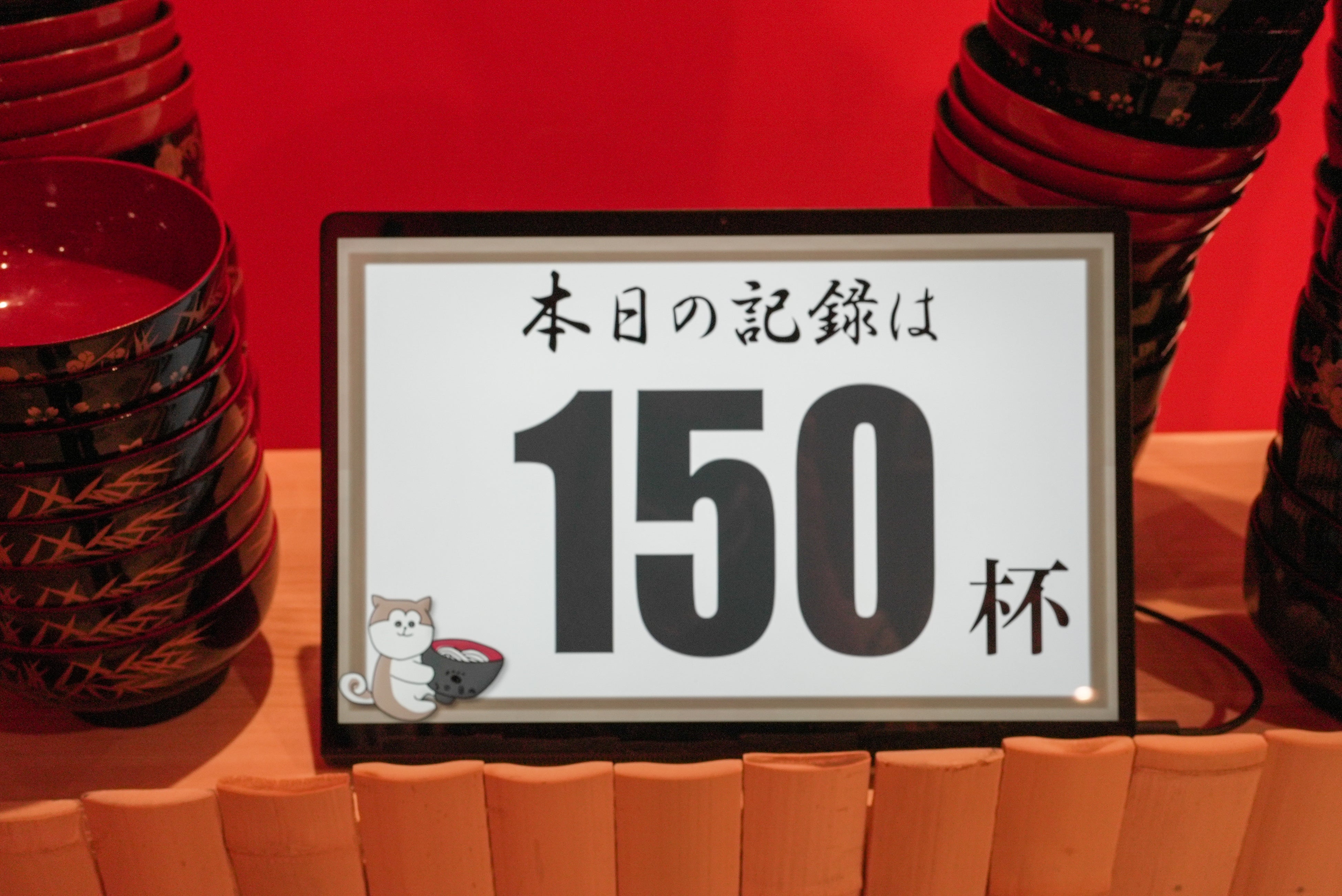 現在は大幅にパワーアップし、店内スクリーンに変更し、常に最高記録を表示し、最高記録更新の際にはオリジナルの映像とともに名前と杯数が店内スクリーンに表示されます。