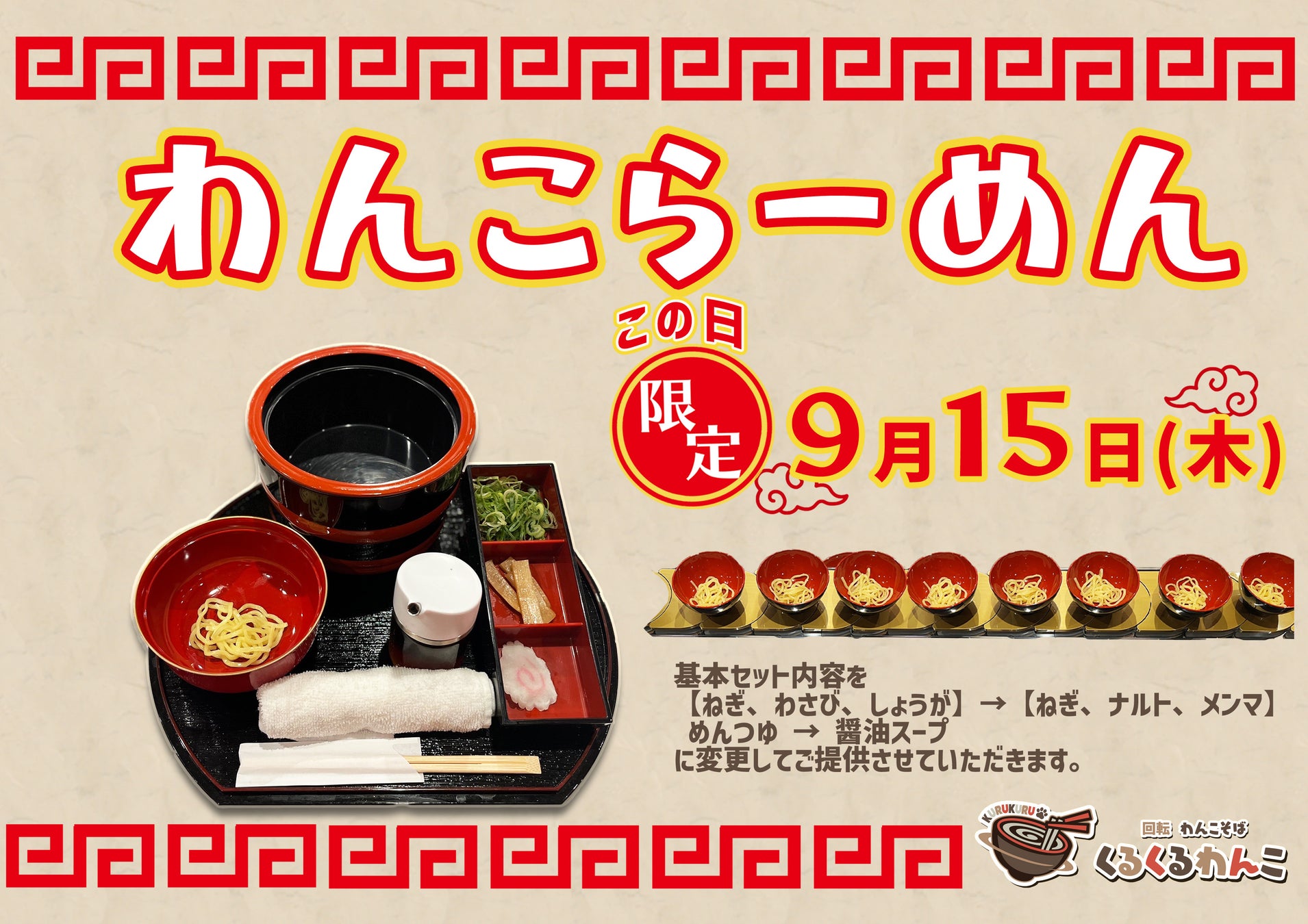 くるくるわんこは、わんこの日(15日)に限定でお蕎麦以外の食材がレーンに乗って流れてきます!日本初の回転わんこらーめんの実施を開始いたしました。