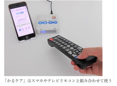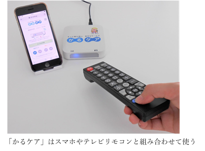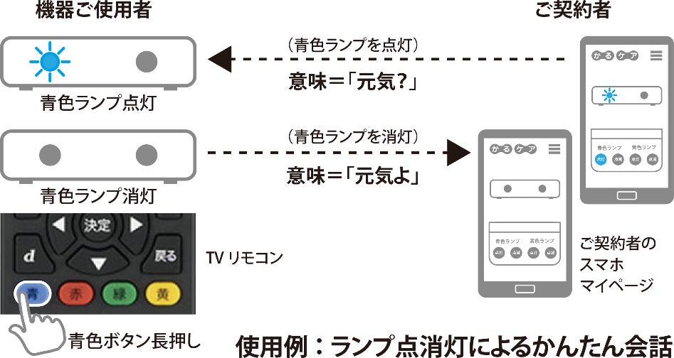 また、「かるケア」は専用機器のカラーランプによる相互交信で、【離れていても家族の気持ちがつながる新しいコミュニケーション方法】を提案する。例えば、見守り者がスマホを操作して高齢者宅の専用機器のランプを点灯させ、高齢者がリモコンのボタンを押して消灯できる。高齢者がリモコンのボタンを押すと、見守り者宛にメールが送信される機能もある。この新しいコミュニケーション方法により、家族に電話やメールをすることに抵抗がある高齢者でも、より家族とつながることを期待できる。