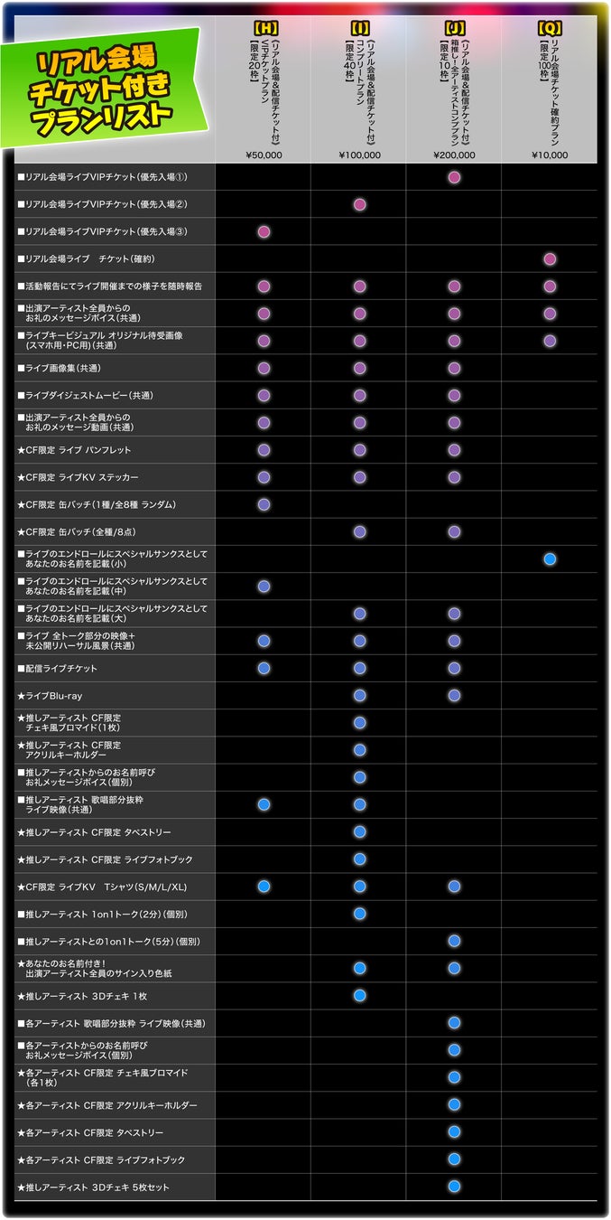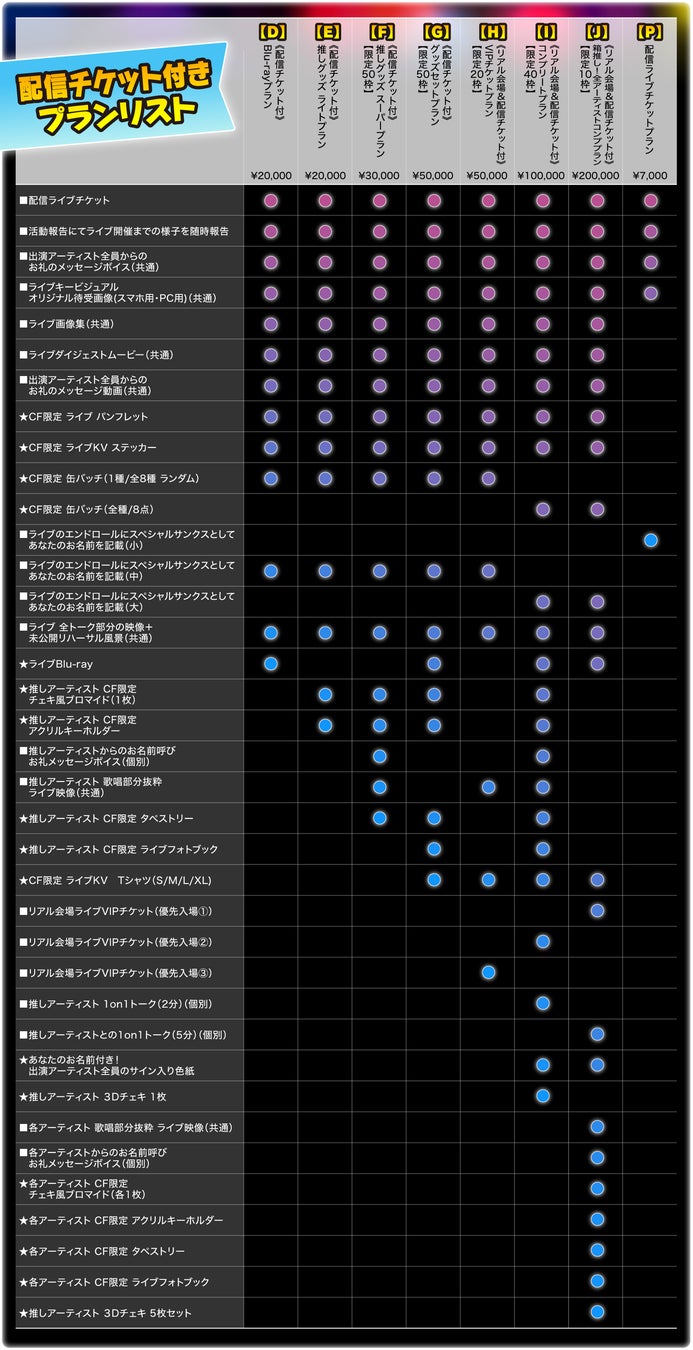その他のプランも内容豊富であり、企業向けのCM動画を制作しLIVE中にて放映される権利「企業様向け!スペシャルスポンサープランー限定1枠ー」、「《リアル会場&配信チケット付》VIPチケットプラン」、「《配信チケット付》 Blu-rayプラン」など、企業向け、推しグッズの提供、支援者が指定する出演予定者との1on1トークまでも用意されている。