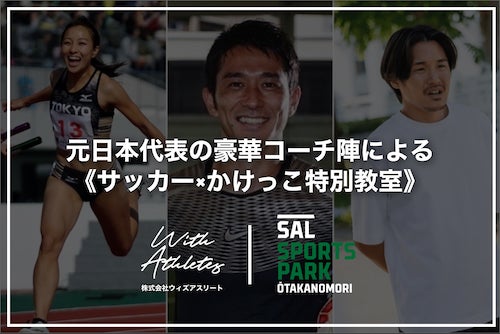 スポーツに関わる全ての人により良い環境を提供することを目指す、株式会社ウィズアスリート(所在地:東京都豊島区 代表取締役:福壽 孝太朗)は、運営するスポーツ施設「SAL SPORTS PARK OTAKANOMORI」にて、10月15日(土)、子ども向けの<サッカー×かけっこ特別教室>を開催します。元サッカー日本代表の玉田圭司さん、元陸上日本代表の小林雄一さん、藤森安奈選手が来校し、子どもたちに直接指導を行います。