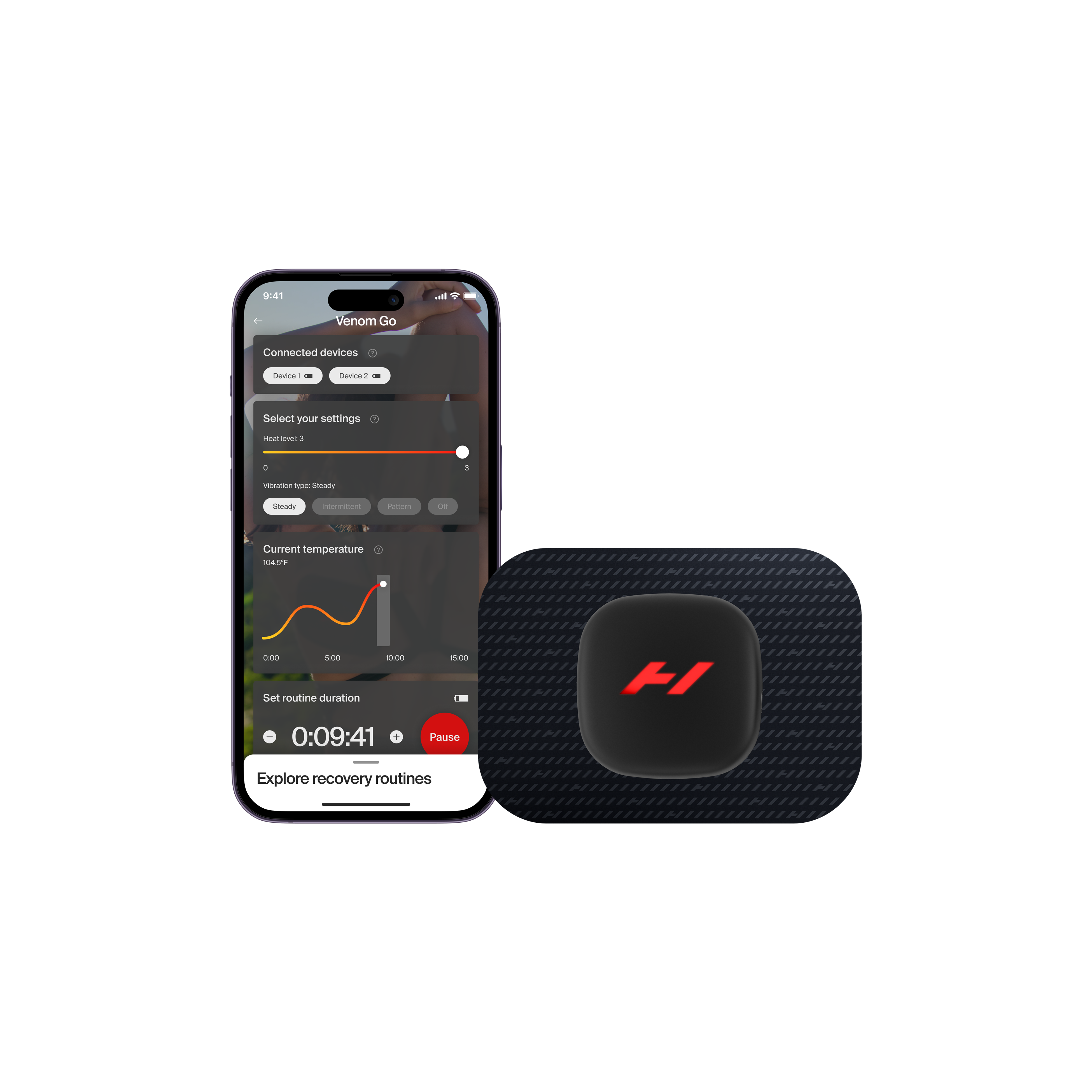 Venom Goは、粘着パッドに磁力で接続するコントロールポッドで構成され、皮膚に直接貼付する熱と振動のウェアラブル。パッドは、約20回再利用可能で(身体への装着状況や汗、ローション、オイルの付着状況により異なります)、ポッドのボタン操作で、3段階の温熱と振動を選択することができます。肌に当ててから約90秒で最高温度45℃に達するため、これまで以上に素早く温かさを感じられるようになりました。コントロールポッドとパッドの重量はわずか90g、フル充電で最大60分使用可能。USB接続で充電され、TSA認可を受けているため旅行中でも使用できます。Bluetooth連携でHyperice Appと接続可能。