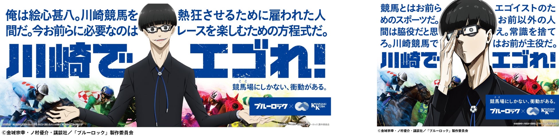 11月・12月のコラボ第一弾では、TVアニメに登場するキャラクター“絵心甚八”の限定デザインQUOカードが当たる「川崎競馬×ブルーロックコラボキャンペーン」をX(旧:Twitter)にて実施するほか、「#絵心甚八のエゴイスト判定」と称してチャットボット機能を使った診断キャンペーンも実施。さらに、競馬場の最寄り駅であるJR川崎駅構内や川崎競馬場内にて、皆様の「エゴ」をかき立てる台詞が特徴的なサインボードを掲出予定です。さらに、今冬には第二弾のコラボキャンペーンや企画の発表を予定していますので、今後も「ブルーロック×川崎競馬」の情報にご期待ください。