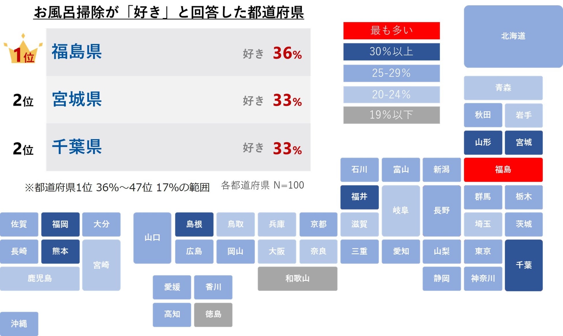 都道府県別では、福島県民が好き(36%)と47都道府県で最もお風呂掃除好きと回答