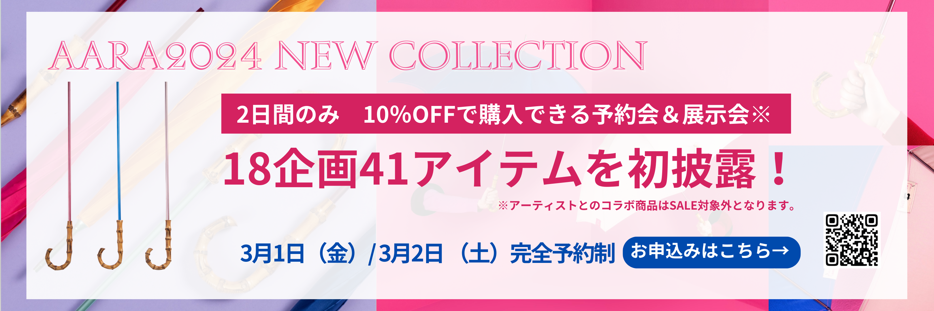 傘はその形もパーツも、明治時代から大きく変化していません。限られた中で、他社がやりたがらない細かい加工やデザイン、斬新な企画などを得意としてきた同社。昨年リリースしたオリジナルブランド「AARA」は「大量生産ではできない日本製の傘」「他社には作れない傘」「邪道でユニークな傘」といったコンセプトで、業界初のカラー骨を採用し、雨傘と遮光傘など76アイテムをリリース。20204年もカラー骨の新色4色を加え、全18企画は全て柄のある生地に。ジャガード生地にヨーロッパのプリント生地、オリジナルプリント生地に、若手クリエイター・若菜みさ氏とコラボレーションしたアート傘にも初挑戦します。同社代表の柴田は、「昨年は無地の傘を展開し、今年は多彩な柄をリリースすることで、AARAとしてようやくスタート地点に立てる。万人ウケする傘ではないからこそ、『好き』と言ってくれる人に届けたい」と話します。3月1日(金)3月2日(土)に展示会を兼ねた予約販売会を開催します。2日間に限り、コラボ商品以外の全商品を10%OFFでご提供します。当日まで、傘の全容は非公開となりますので、ぜひ、この機会をお見逃しなくお立ち寄りください。