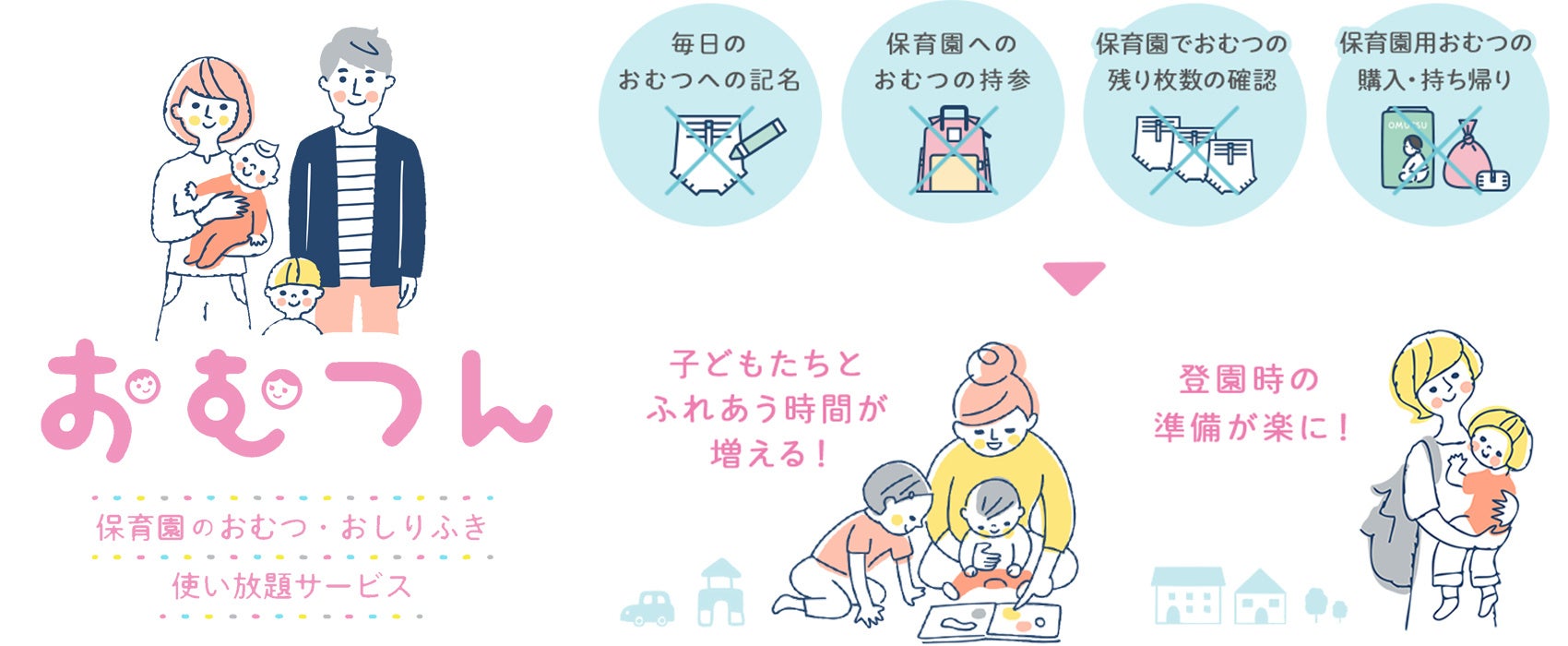 2019年11月にサービスを開始した「おむつん」は、保育施設で使用する紙おむつ・おしりふきが使い放題になるサブスクリプションサービスです。