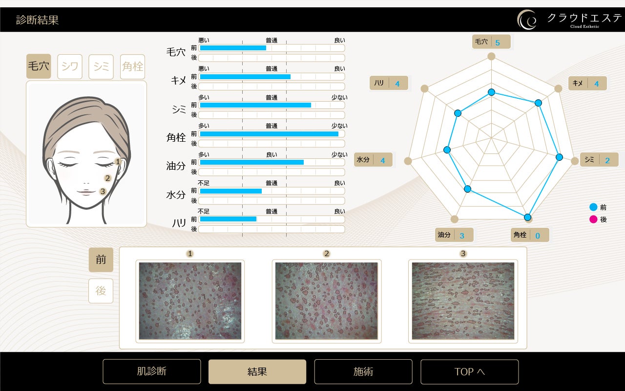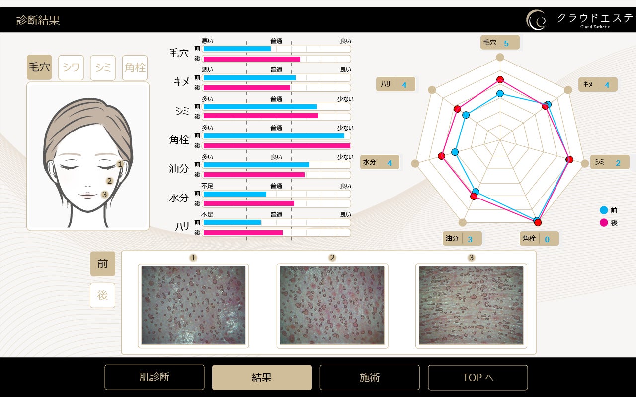 施術前後に撮影や測定を行うことにより、肌データはクラウドで保存され、エステ効果が一目でわかります。