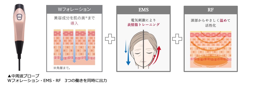 中周波は低周波(熱作用)と高周波(刺激作用)の間に位置し、両方の作用が発生します。EMS機能は低周波で普段使わない顔のインナーマッスルに作用し、筋肉を引き上げます。RF機能は高周波で肌の深部を温めることで、ハリのある肌をつくります。また、中周波には、Wフォレーションと名付けた美容成分導入作用もあり、細胞と細胞の間に微細な隙間をつくることで、美容成分を奥まで届けることができます。
