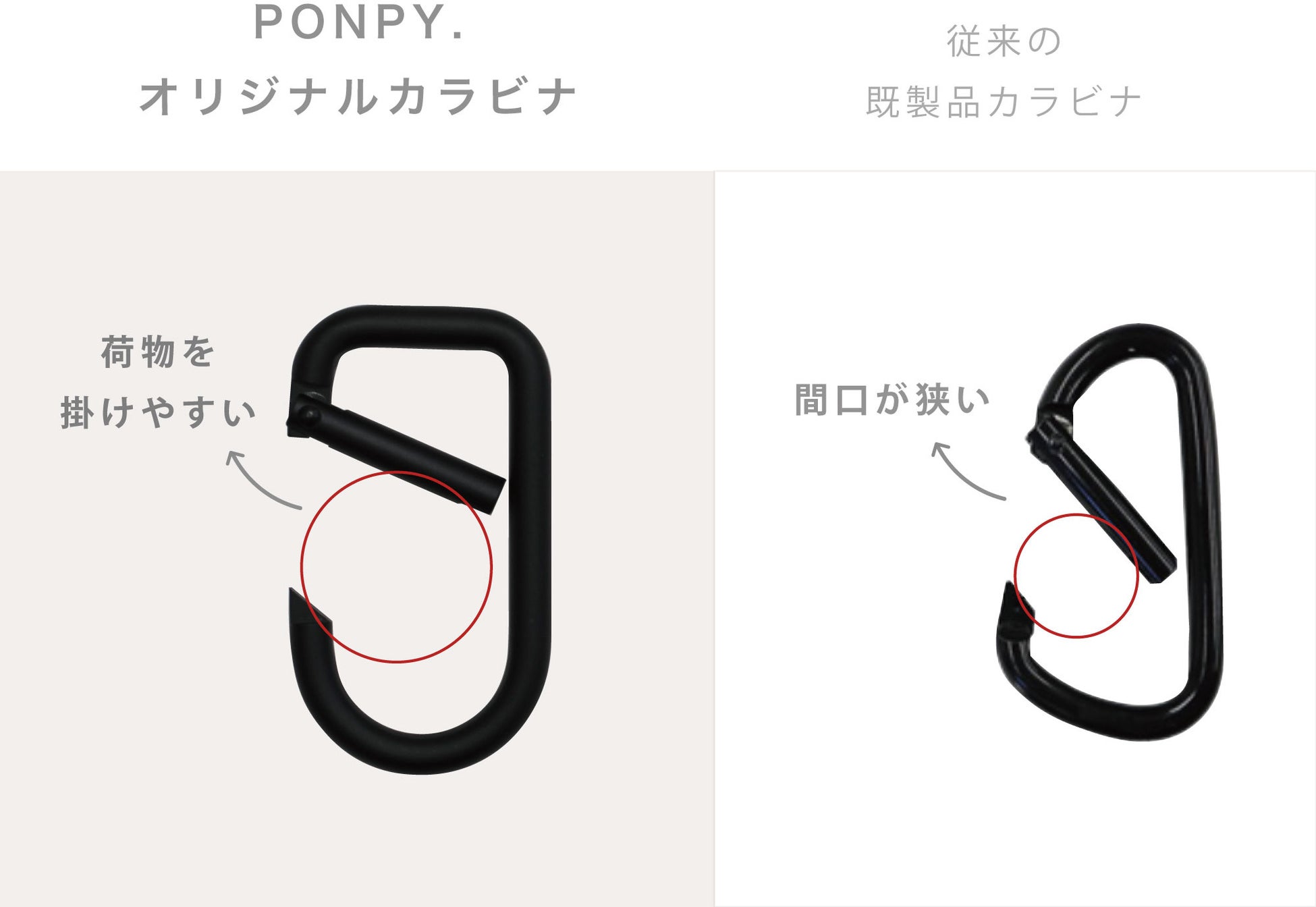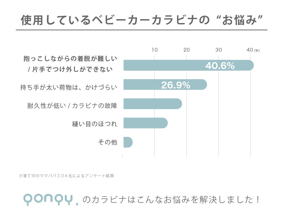 これまでの“ベビーカーカラビナ”の問題は、荷物の着脱が片手でできないこと。
