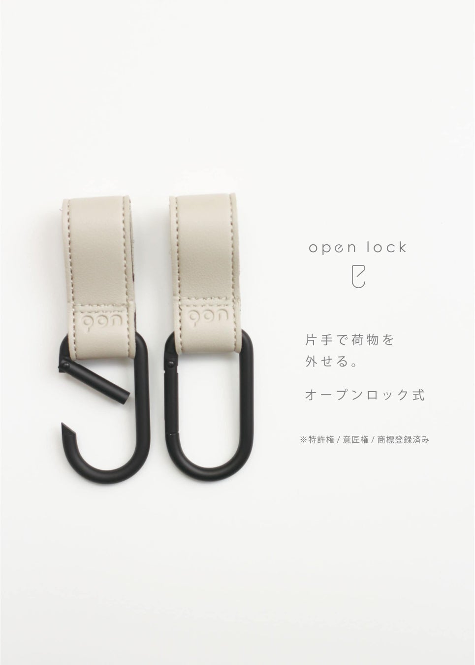 一見シンプルなカラビナだが、【オープンロック機能】でカラビナのゲートが開いたままロックされるため、片手での荷物の着脱がスムーズに。シンプルなだけではなく、盗難防止・片手で使えるなど実用性を兼ね備えたベビーカーフック。