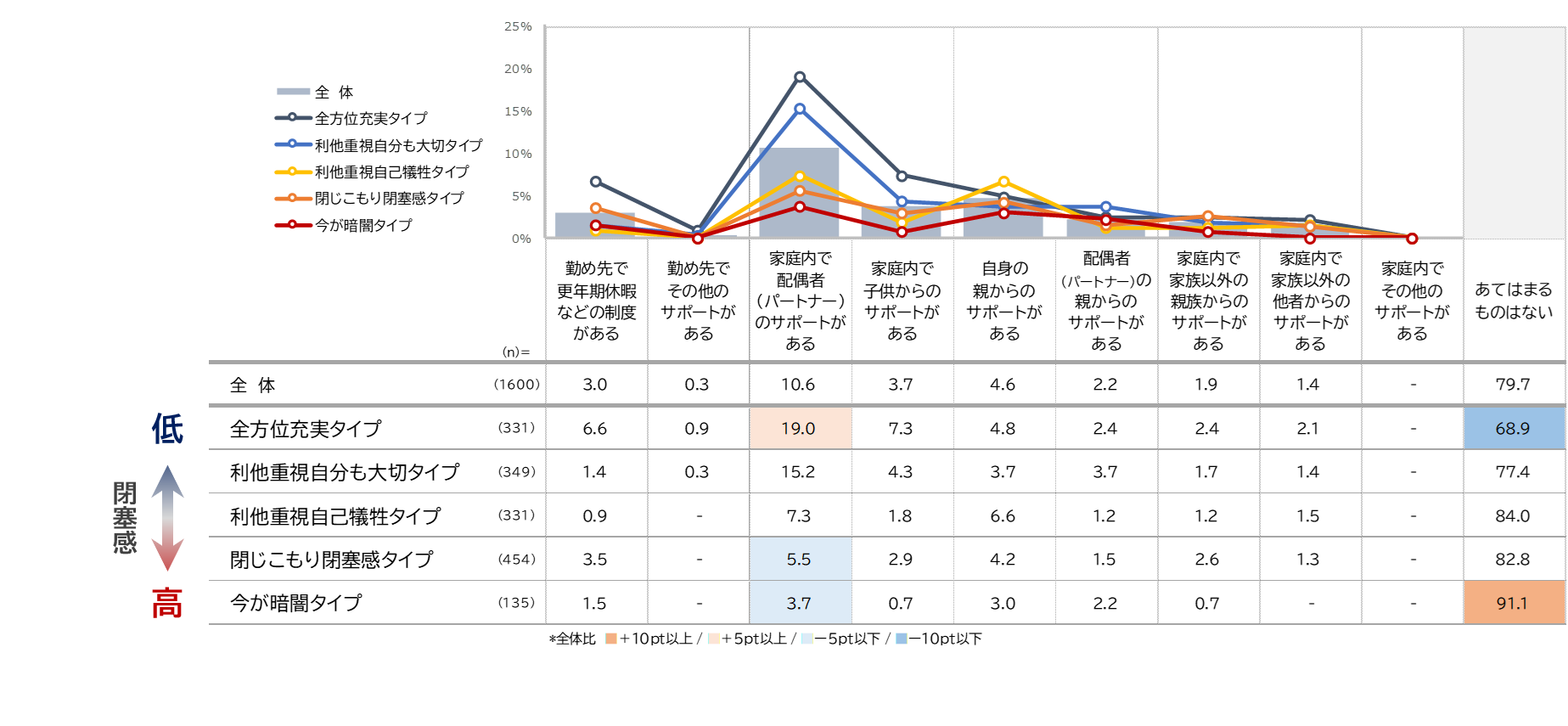 また、閉塞感が低い「全方位充実」と、「利他重視・自分も大切」タイプほど“配偶者・パートナーのサポート”があり、更年期の不調対策に向け、「幸年期」を過ごすための“アクション”へ1歩踏み出す“後押し”となっていることが分かります。従って、更年期の不調による閉塞感は、“周りの理解・サポート”でポジティブに変化することが分かりました。