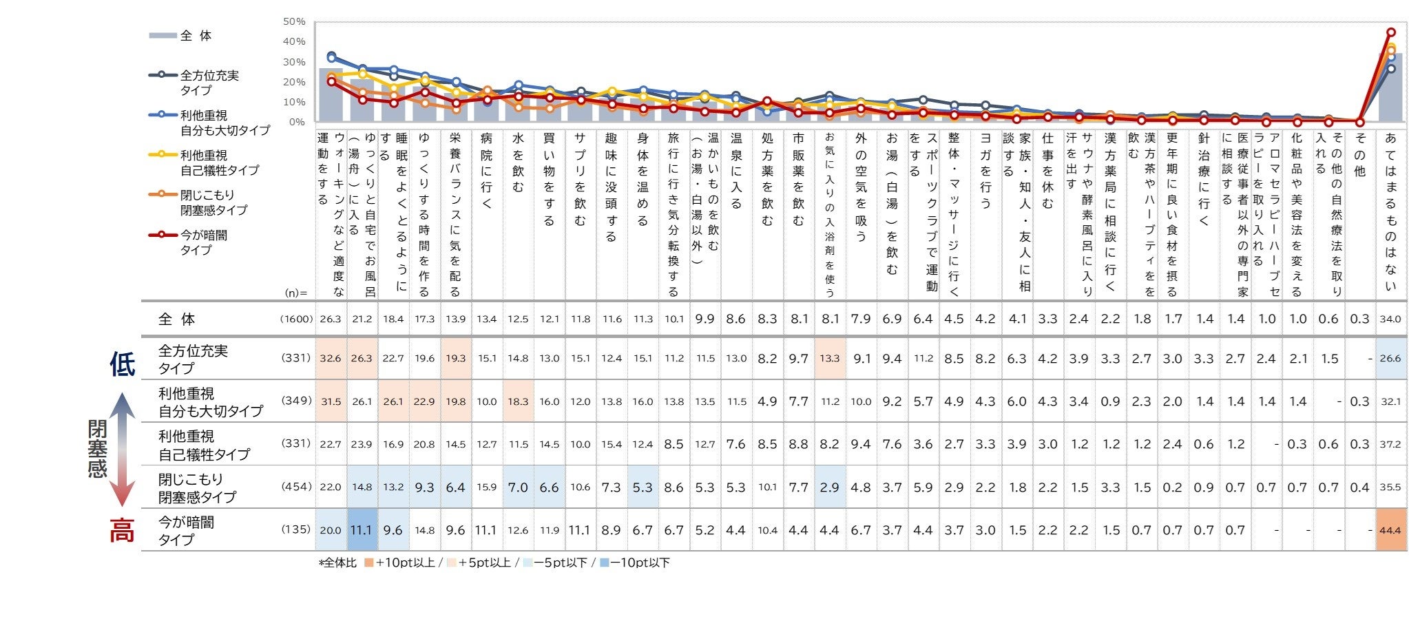 「全方位充実」タイプ、「利他重視・自分も大切」タイプは体調改善のために積極的に何らかの対処をしている傾向が顕著。