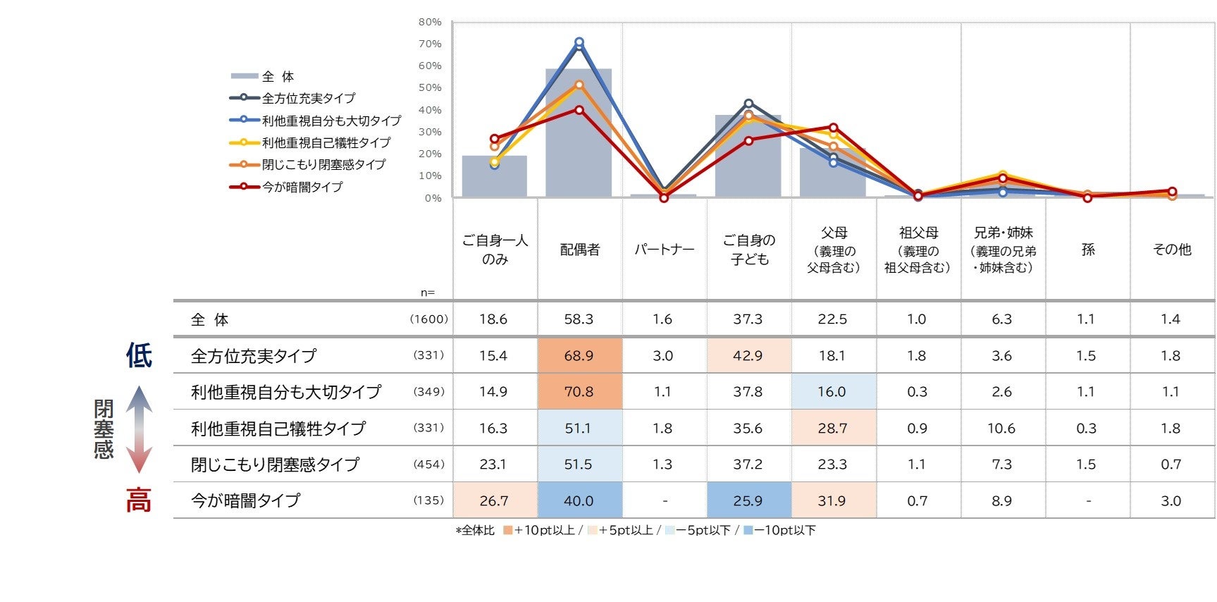 - 男女ともに「全方位充実」タイプ、「利他重視・自分も大切」タイプは、配偶者や子どもとの同居率が高い一方で、閉塞感が高くなるほど独居率、未婚率が高くなる傾向