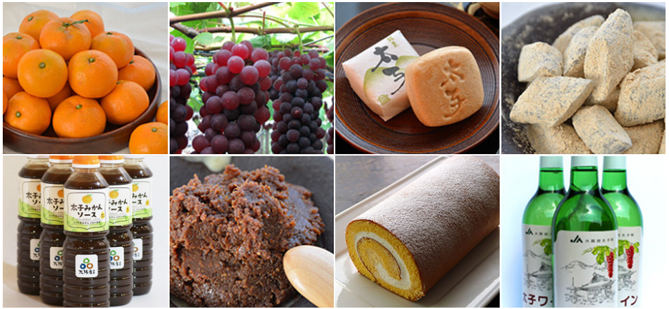 太子町はぶどうの生産やみかんの生産に適した地形と気候です。ぶどうは特に巨峰やデラウェアの生産が盛んで、味・出荷量ともに大阪を代表できるものです。また、ピオーネ・シャインマスカットといった大粒ぶどうの味も抜群です。(“太子みそ”は、一時生産を中止)