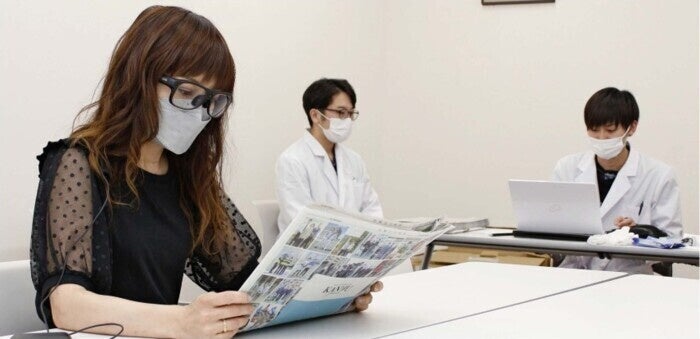 調査は諏訪東京理科大(長野県)の篠原菊紀教授(脳科学)の研究室と共同で実施。5月30日、6月1、2日の3日間、甲斐市西八幡の新聞センター玉幡本社で行いました。若年層、中年層、高齢層の男女5人ずつ、計30人にメガネ型の装置を付けてもらい、視線の動きを調べました。