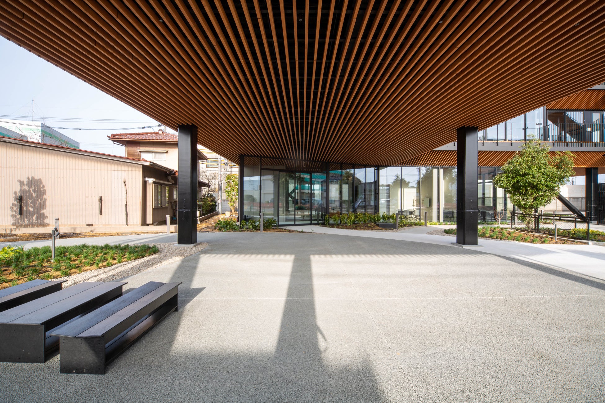 風が抜けるピロティ空間には車寄せや駐車場だけでなく、薬になる木々や様々な草花が植えられ、医薬品業界の中で地球規模の視野で製品を作る薬品の原点を見つめ直すことができるようにしています。車寄せの融雪やピロティやデッキの植栽の灌水には北アルプスから神通川を通して富山湾に流れ込む地下水を井水として汲み上げて使用しています。町内会で管理している隣接した公園も同時に整備して連続させることで、社員だけでなく、近隣住民や訪問者も散策できる憩いの空間としています。
