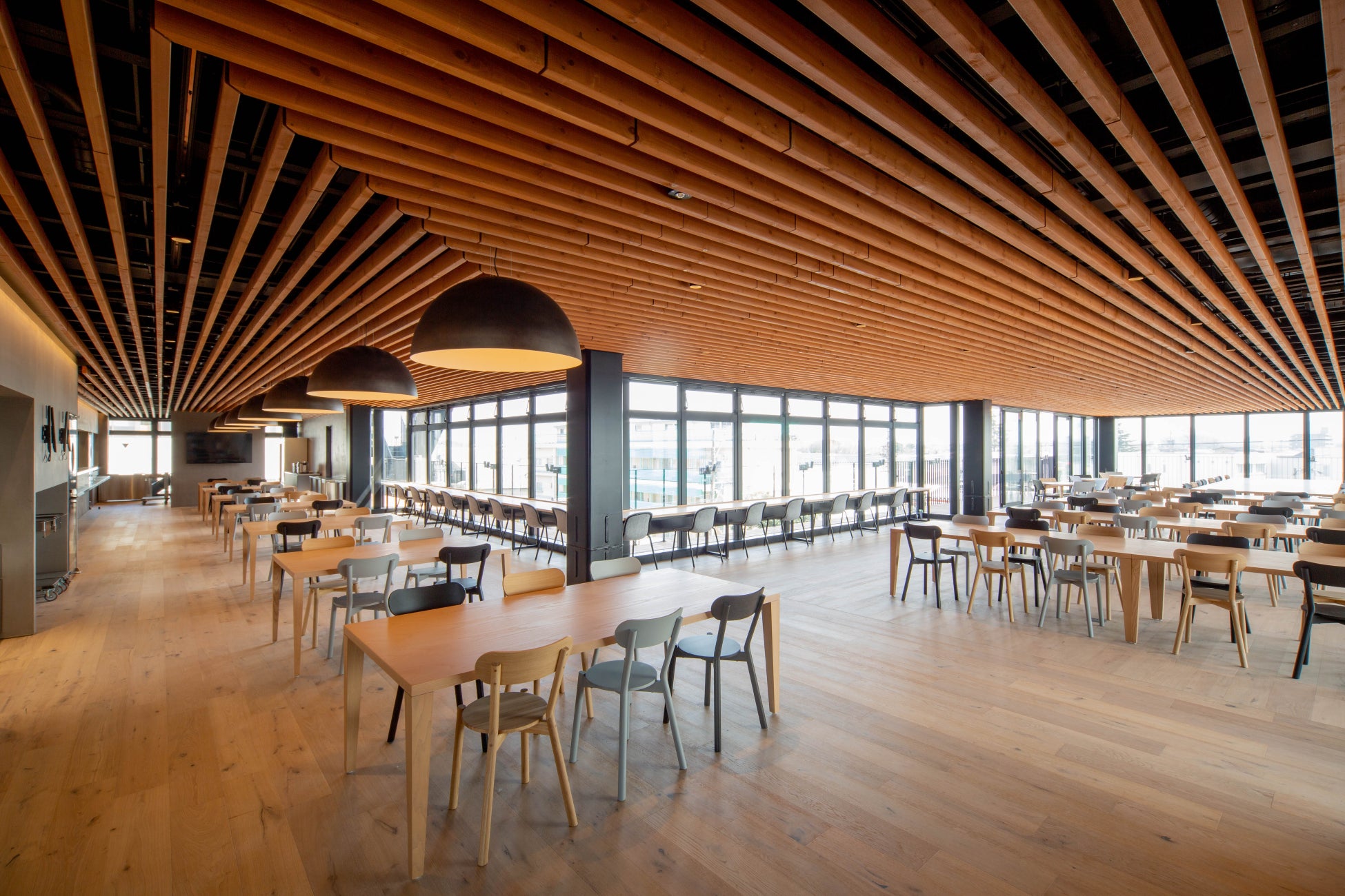 3Fには本社屋で働く社員だけでなく、工場群で働く社員も集まる食堂があります。社員の満足度を高めるだけでなく、健康管理や社内外のコミュニケーションの活性化にもこの食堂は役立ちます。工場にいる社員もただ食事をして戻るだけでなく、リラックスが出来る様に、食堂内にラウンジエリアを設けました。