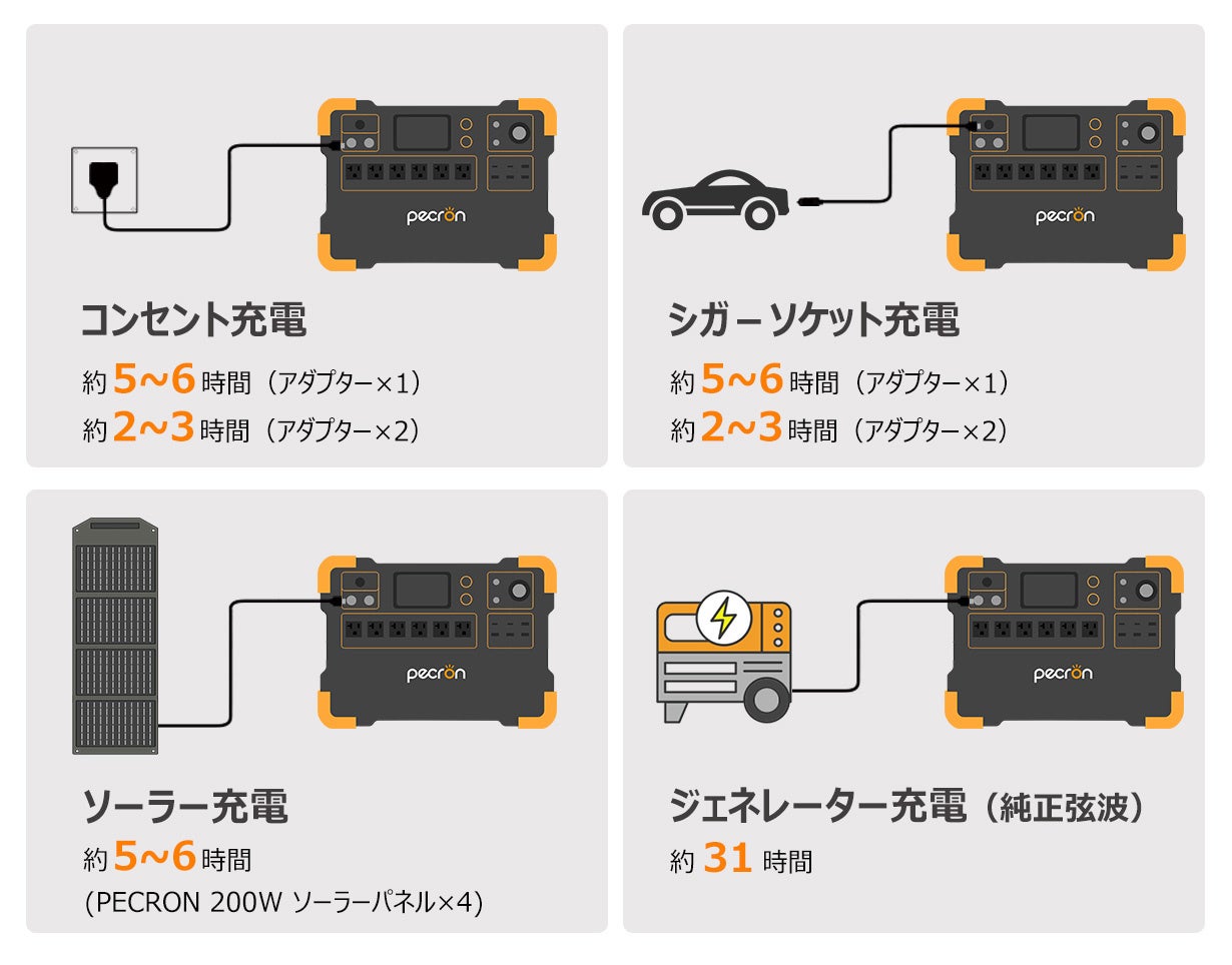 「PECRON E3000」にはコンセント充電、シガーソケット充電、ソーラー充電、ジェネレーター充電(純正弦波)の4つの充電方法があります。