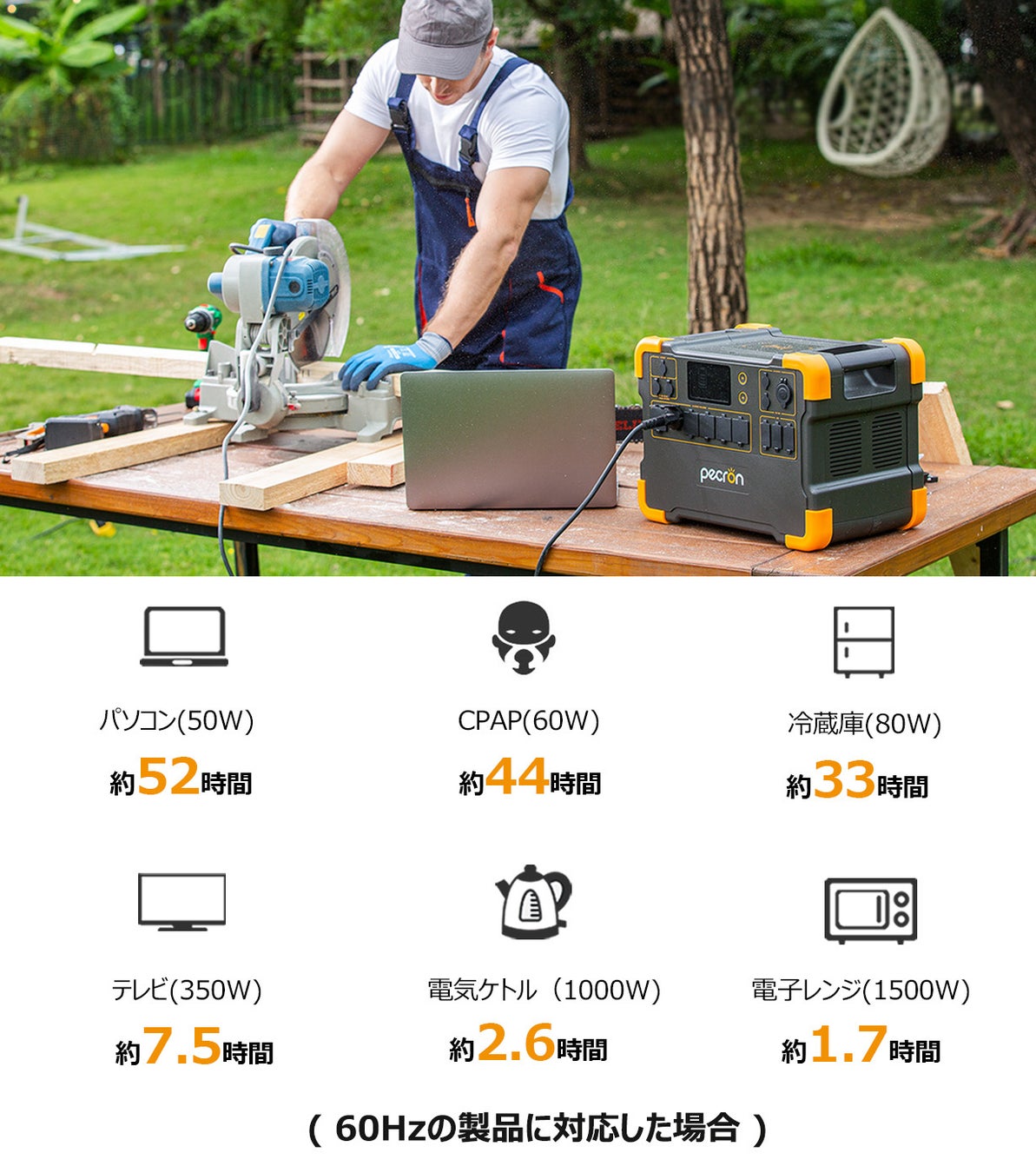 「PECRON E3000」は、多機能・高品質なポータブル電源です。3108Wh/863000mAhの超大容量と2000Wの高出力を兼ね備え、ほとんどの電気製品に給電可能。60Hzのみ対応しております。定格出力2000W以下、瞬間最大出力4000W以下のほぼすべての電気製品に対応可能。