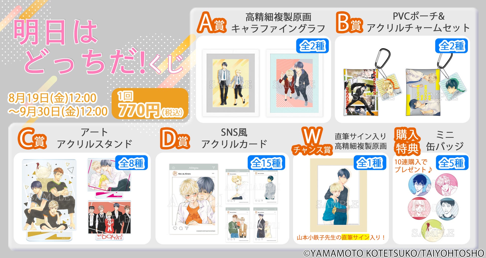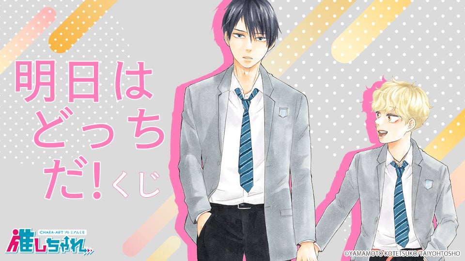 キャラアート株式会社(代表取締役社⻑:井上裕⽂)は、オンラインくじサービス「推しちゃれ」において、ボーイズラブコミック雑誌 ihr HertZ(大洋図書)で大人気連載中の『明日はどっちだ!』(山本小鉄子/著)の限定グッズが⼿に⼊るオンラインくじを、2022年8⽉19⽇(⾦)12時より販売します。