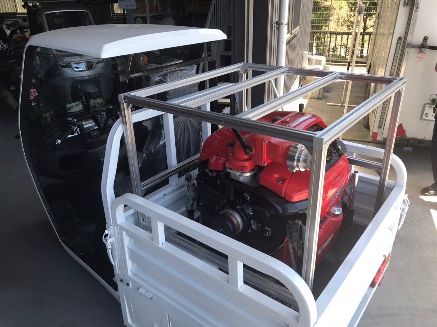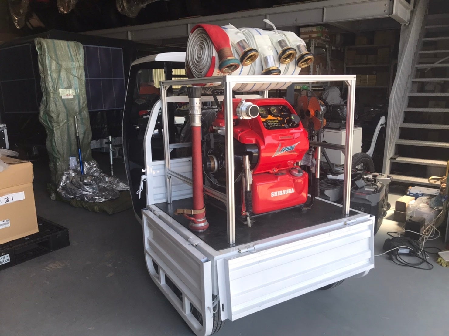 今回公開する電動走行バイク「エネバイ」は、従来はトゥクトゥクと呼ばれる3人乗りのトライクを消防バイクとして使用できないかと想定し、2013年より開発を始めました。消防ポンプは、D級、C級、B級の順でサイズが大きくなり、放水性も高くなります。従来は小さなD級ポンプしか載せることができませんでしたが、より大きく重たいB級ポンプを載せられるように自社での研究・改良を繰り返し、消防ポンプはもちろんのこと、さまざまな道具を載せられるようになりました。
