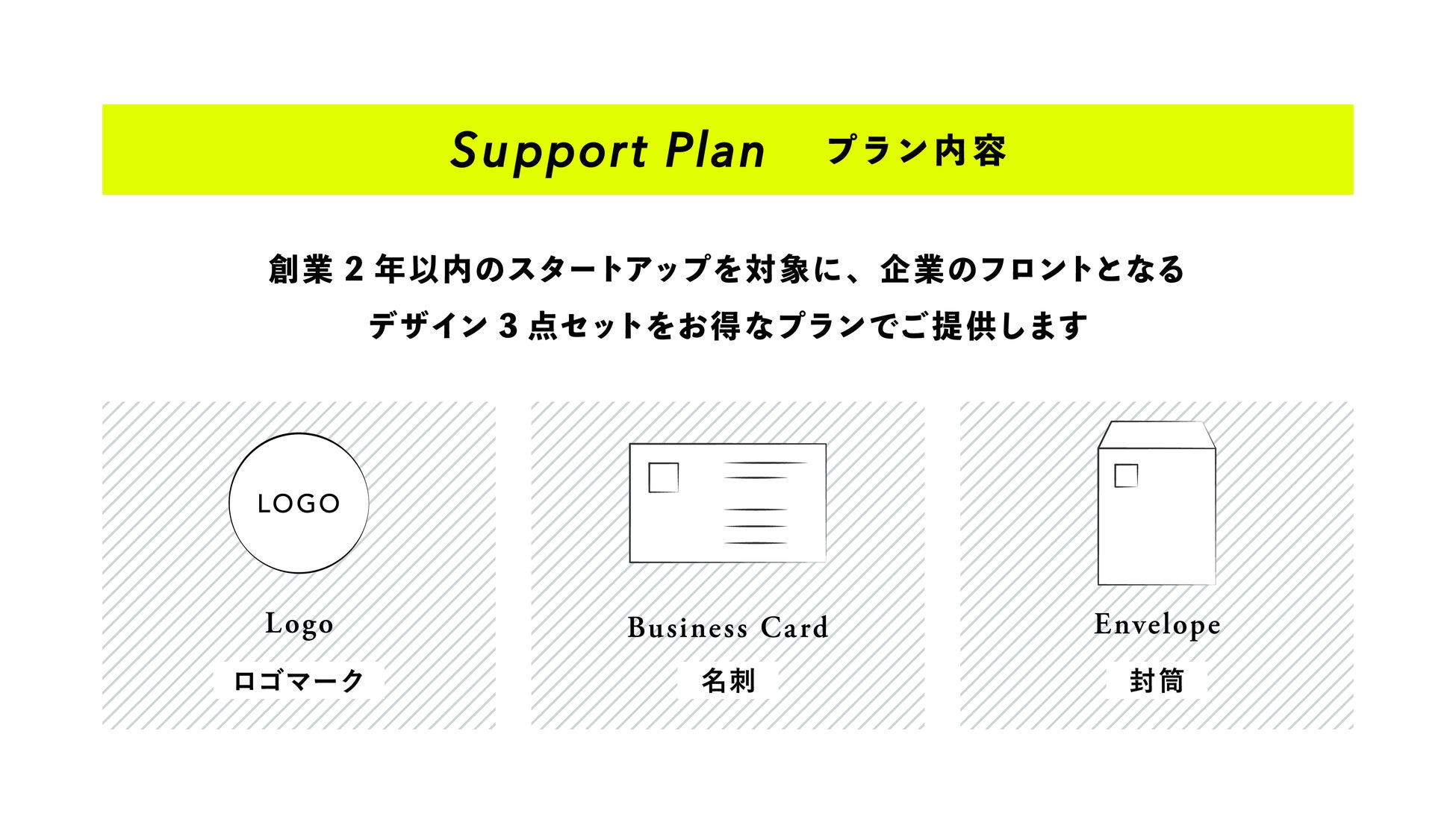 本サポートプランでは、スタートアップに制作がほぼ必須とも言えるロゴデザイン、名刺デザイン、封筒デザインがセットになっており、企業のイメージを的確に伝えるための手助けとなるサポートプランです。