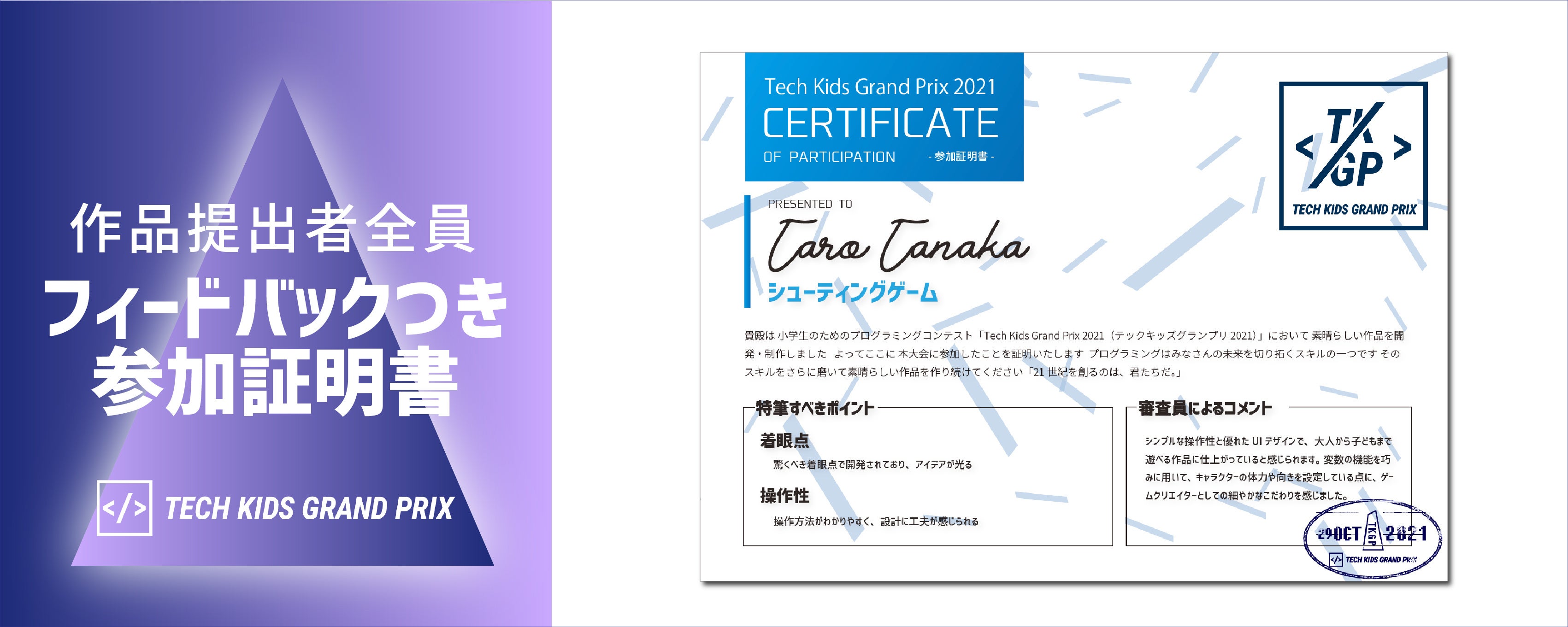 ・「Tech Kids Grand Prix 2022参加証明書」とともに作品へのフィードバック (メールにて送付)