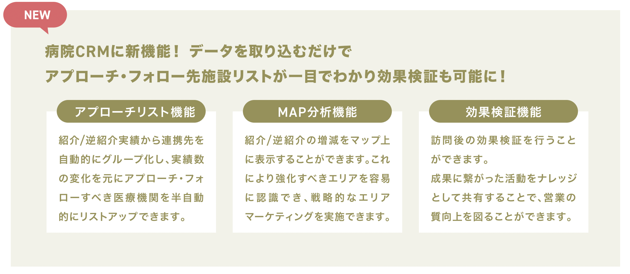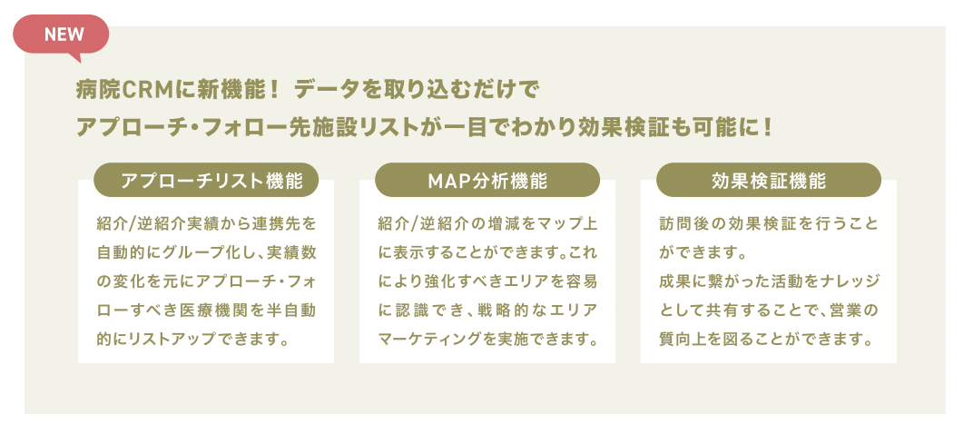 紹介・逆紹介データを取り込むだけで、アプローチ・フォロー先施設リストが一目でわかり効果検証も可能に!