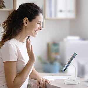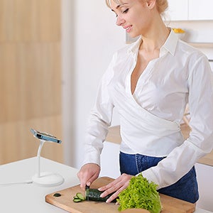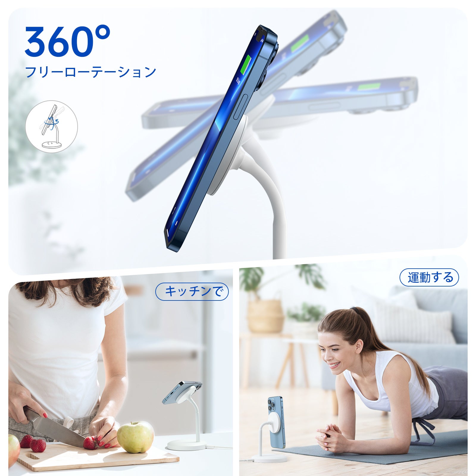 約360°自由な角度調節、柔軟に快適な視野角を調整し、手を解放し、肩や首をリラックスさせます。画面が見やすい角度に合わせてiPhoneを固定することができます。ベースは安定しており、使用中に揺れることはありません。縦・横 両方向に対応、デバイスの向きは縦横問わずに設置できるので、オンライン会議や動画を快適に視聴しながら充電ができます。