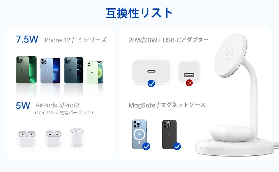 | 対応機種 | iPhone 13 / 13 mini / 13 Pro / 13 Pro Max iPhone 12 / 12 mini / 12 Pro / 12 Pro Max AirPods 3 / Pro / 2(ワイヤレス充電バージョン) |