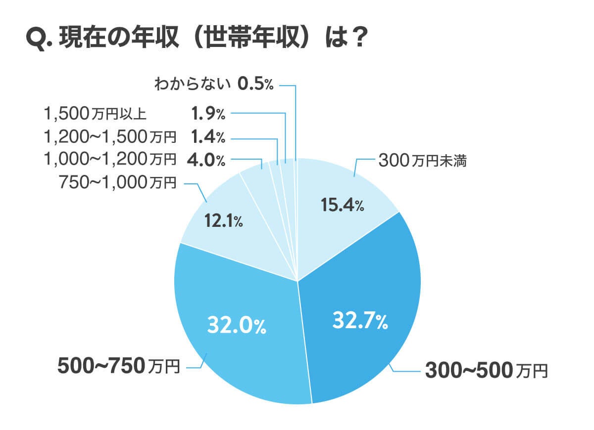 続いて多かったのが500~750万円の32.0%で、年収が300~750万円の間の方が64.7%という結果になりました。