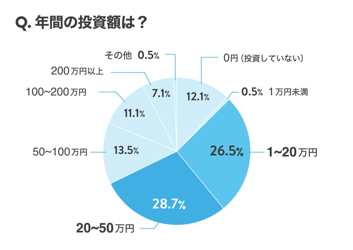 続いて多かったのが1~20万円の26.5%で、全体の55.2%の方が年間1~50万円の範囲内で投資を行っていることがわかりました。