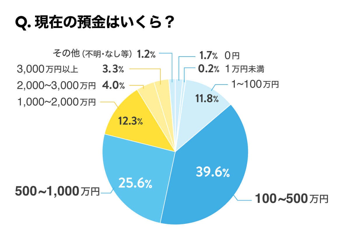 続いて多かったのが、500~1,000万円の25.6%で、現預金が100~1,000万円の範囲内の方が65.2%と、全体の6割以上に上ることがわかりました。