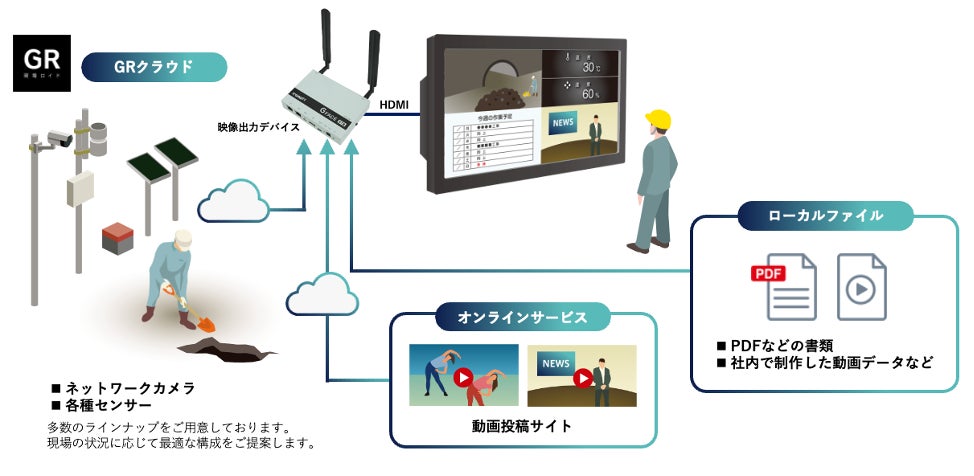 一方屋内の場合は、建設現場の監視用として現場事務所での使用や、監視カメラ管理用途としての使用が可能なシステム構成となっています。