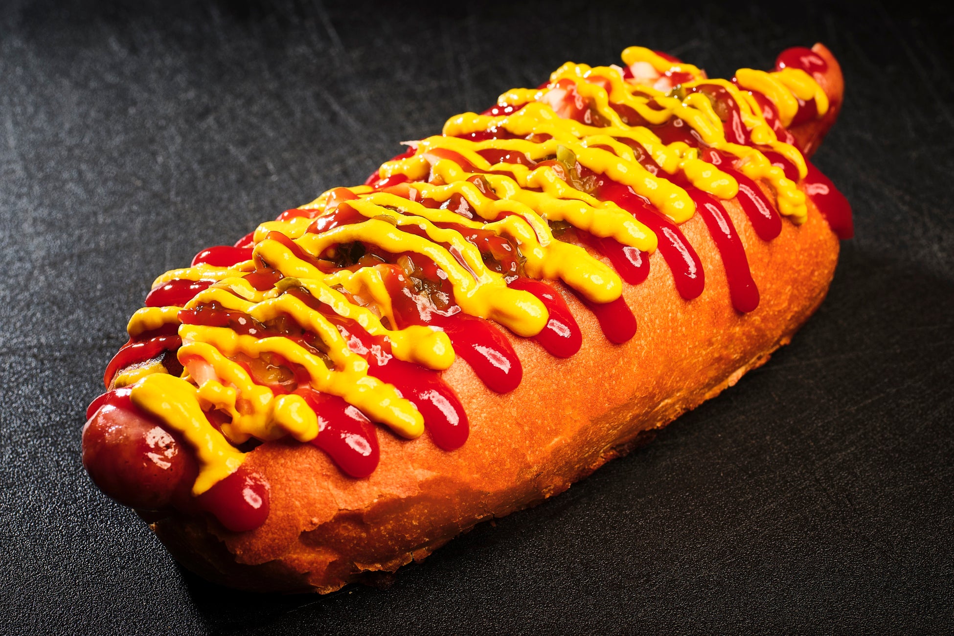 パンにソーセージを挟み、ケチャップとマスタードをたっぷりかける。