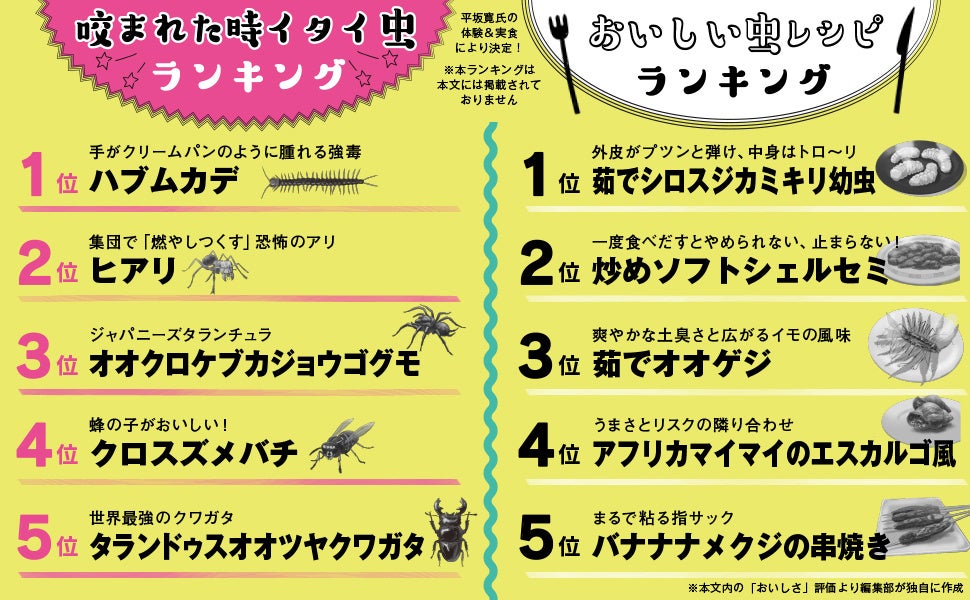 本書に登場する虫・料理をランキング形式で紹介!平坂氏の体験&実食により、「咬まれた時イタイ虫ランキング』『おいしい虫レシピランキング』が決定しました!それぞれの虫や料理のエピソードは本書をチェック!