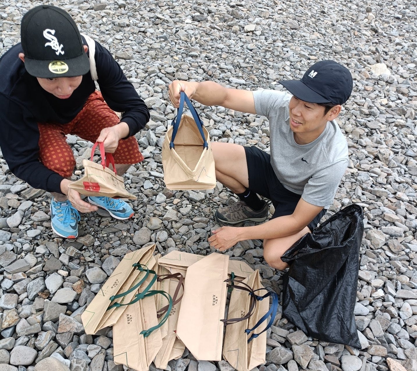 そこで個人的に取り組んでいた水切りで、石採取用に試作検討を重ねた結果、石を満載しても壊れない「米袋の水切り石バッグ」の開発に成功しました。