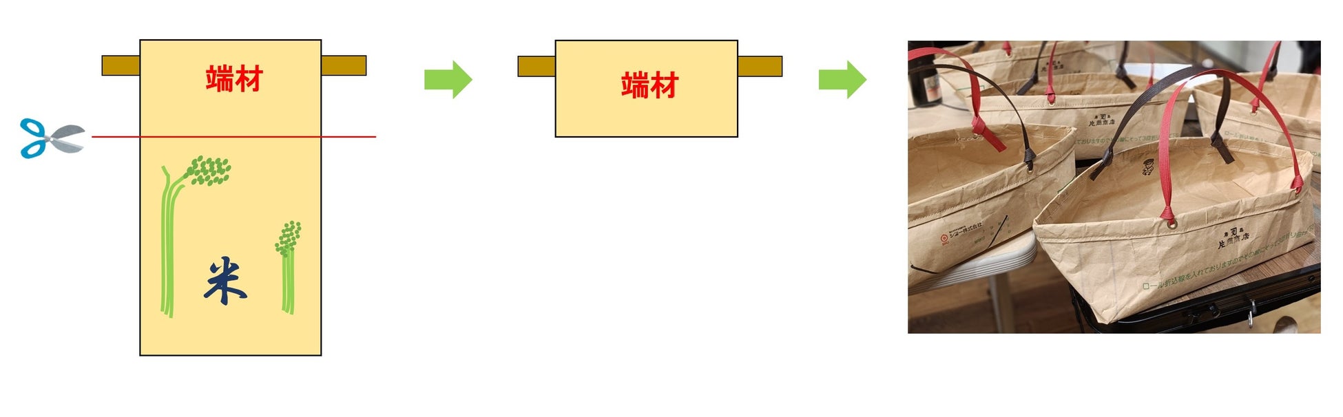 原料となる米袋はシコー株式会社の山口工場(三栄紙工:山口県岩国市玖珂町4888)で製造されたものを使用。