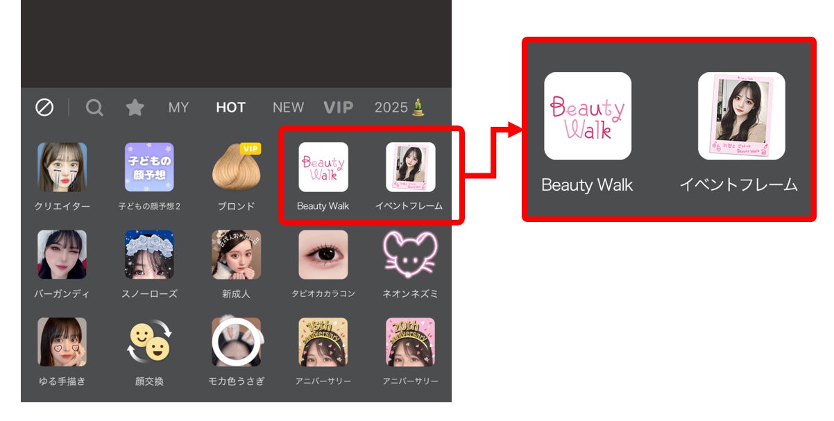 SNOWアプリを起動して「HOT」のタブを選択。サムネイル名「BeautyWalk」「イベントフレーム」から、それぞれダウンロードしてご利用いただけます。