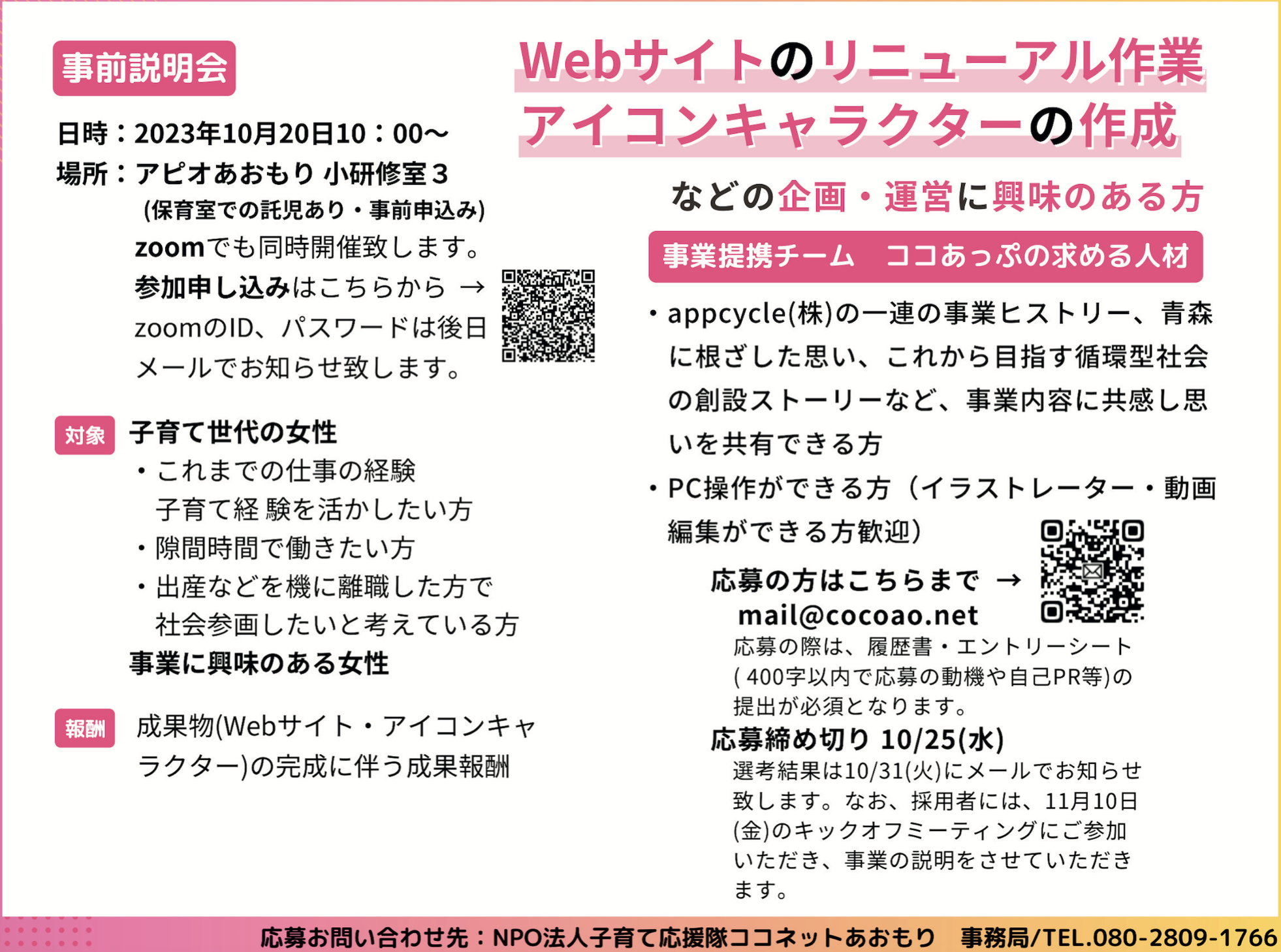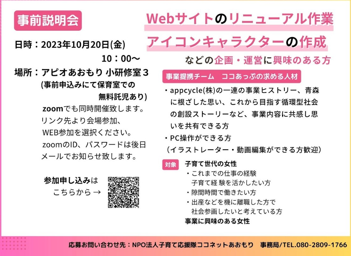 NPO法人子育て応援隊 ココネットあおもりとappcycle株式会社の提携企画第一弾!スタッフ募集。事前説明会開催!